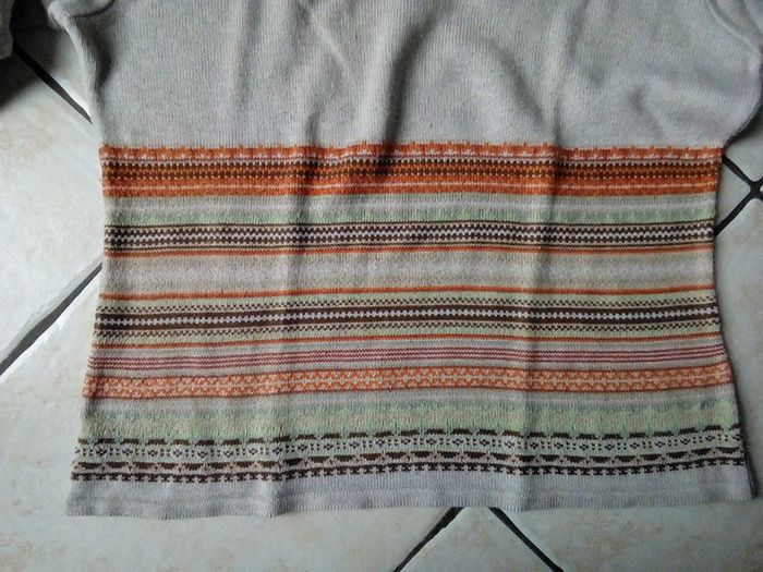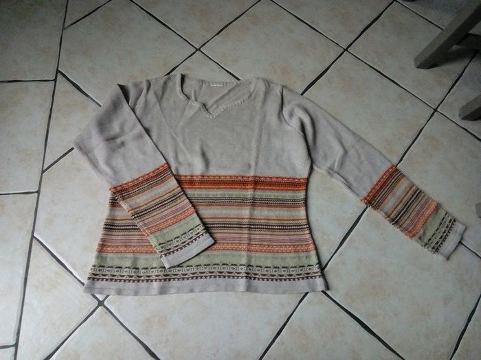 Pull mi-saison beige à motifs dans les tons orangé, marron, blanc et vert Col tunisien. Étiquette de taille coupée mais correspond à un 38/40 #marieb44260vetementsfemme