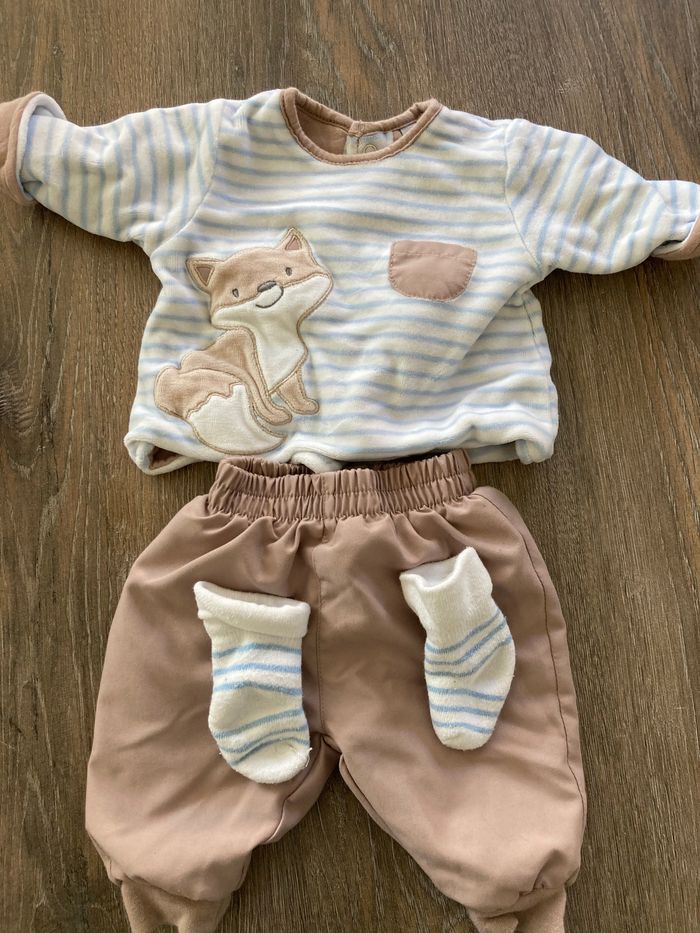 Vends ensemble bleu clair et marron en polaire pantalon haut et chaussettes assorties. En excellent état