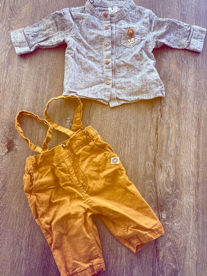 Vends ensemble salopette Camel avec chemise grise.