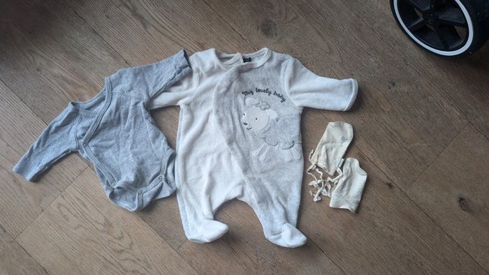 Très bon état : bodie ouverture kimono et pyjama ouverture latérale, très pratique pour ne pas passer la tête du bébé. Moufle pour éviter que bébé se griffe ! Petit mouton sur le pyjama