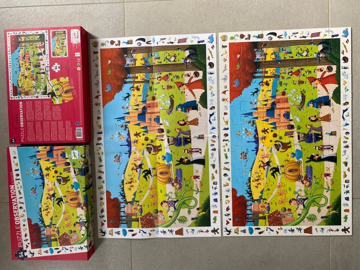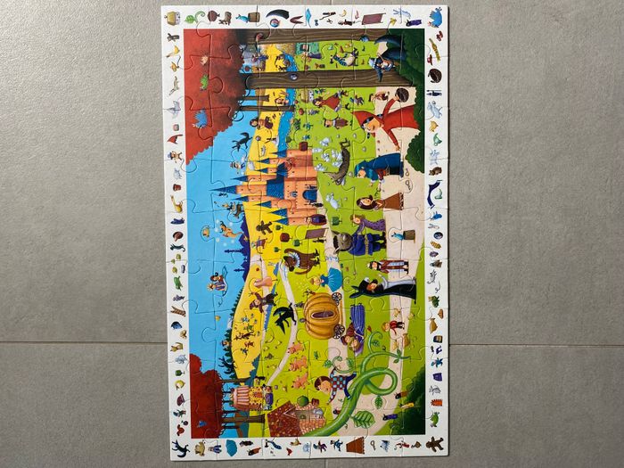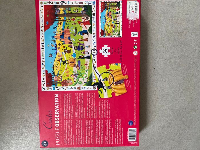 Puzzle Observation Djeco Contes Thème : les contre donc le petit chaperon rouge, les 3 petits cochons, cendrillon, la belle au bois dormant etc réunis sur la même image ! 54 pièces A partir de 4 ans Complet avec poster 61*38 cm 2 jeux en un : faire le puzzle mais aussi retrouver les éléments de la frise dans l’image centrale.