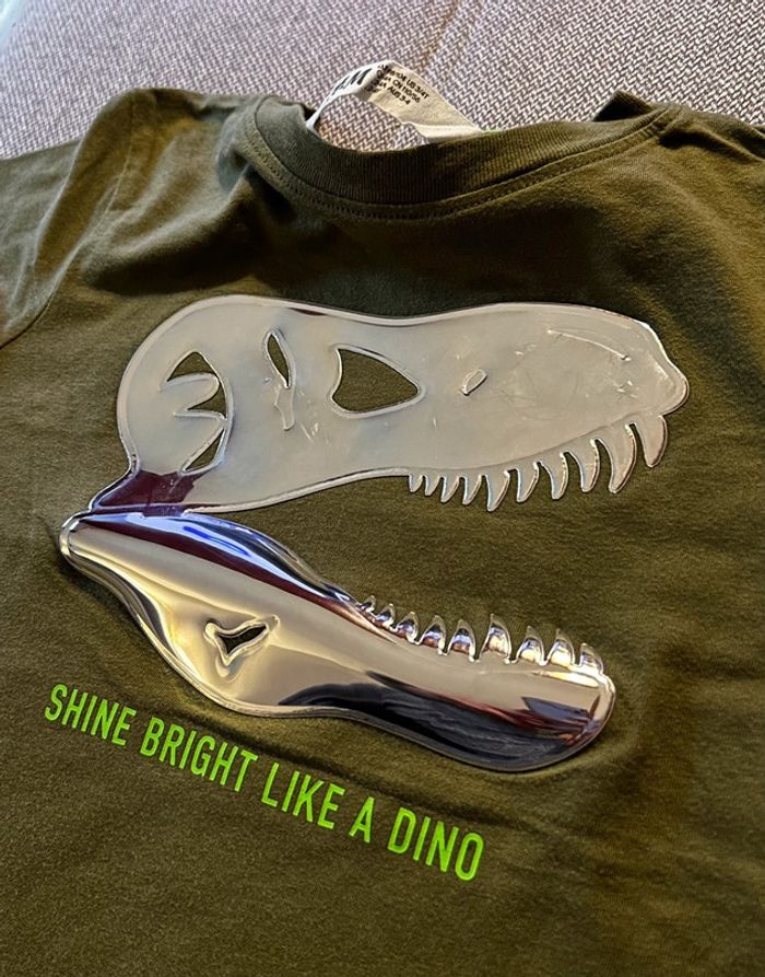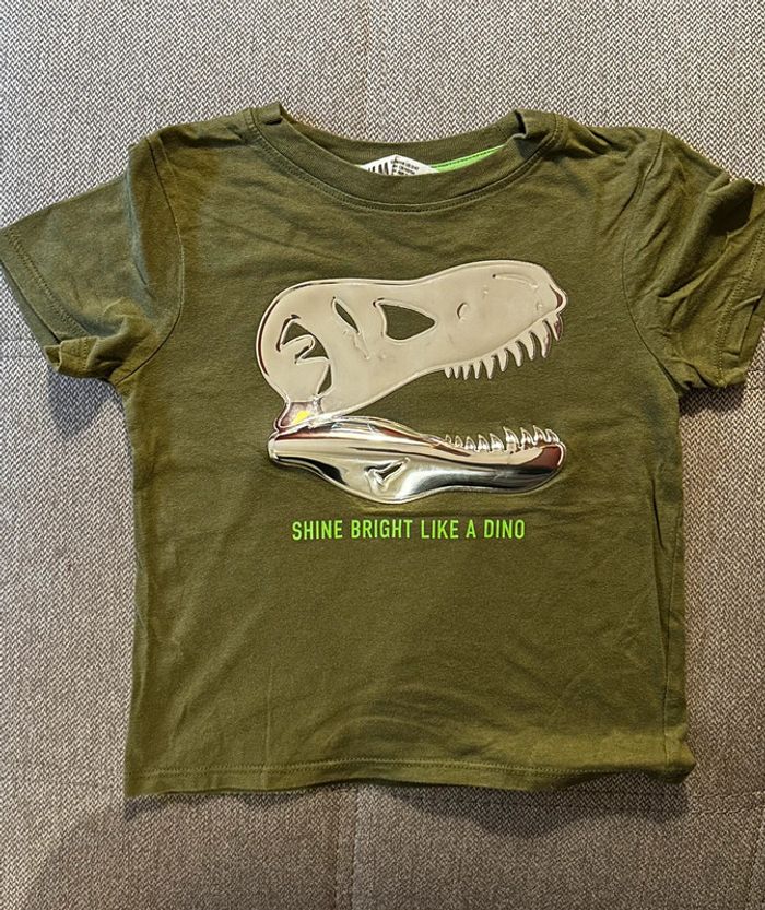 T-shirt manches courtes de couleur kaki, avec une tête de dinosaures et effet miroir Taille 3-4 ans