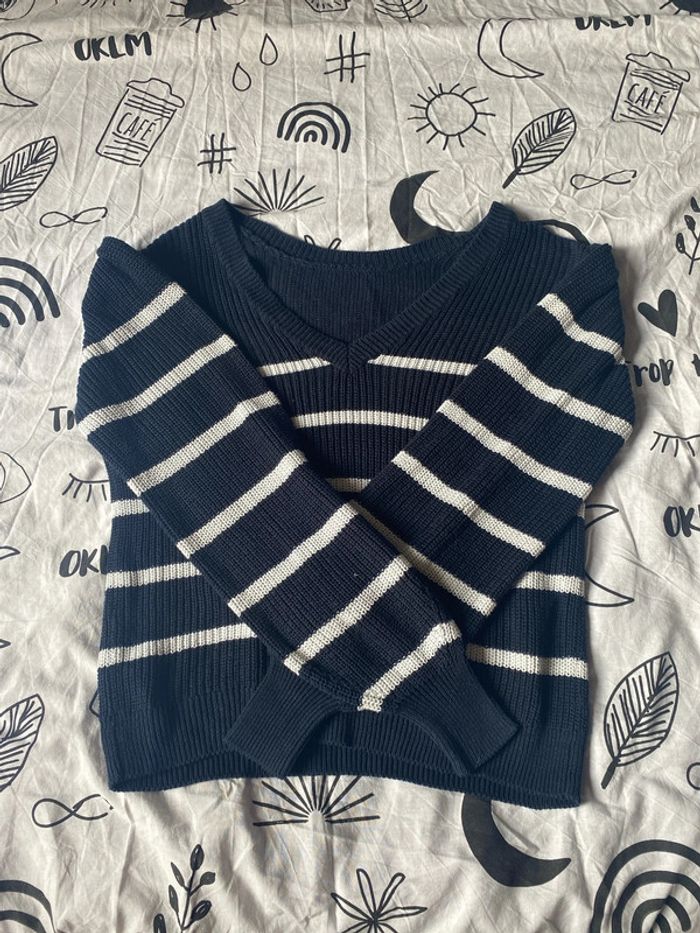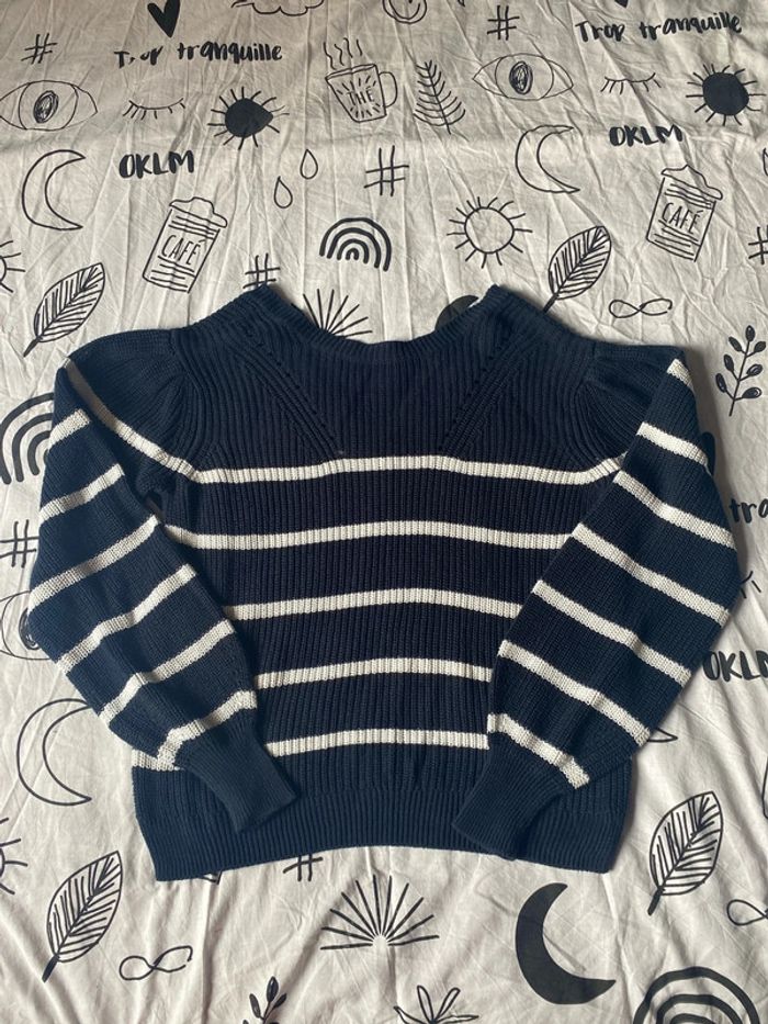 Pull marinière bleu marine et blanche Kiabi M On peut le porter dès 2 côtés, soit le décoller devant soit derrière
