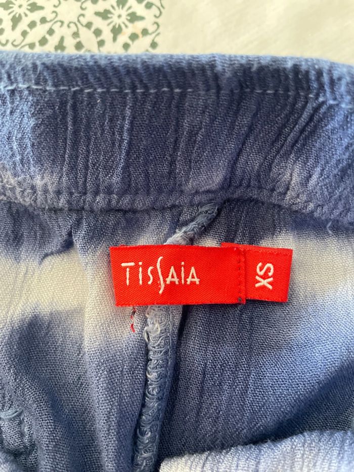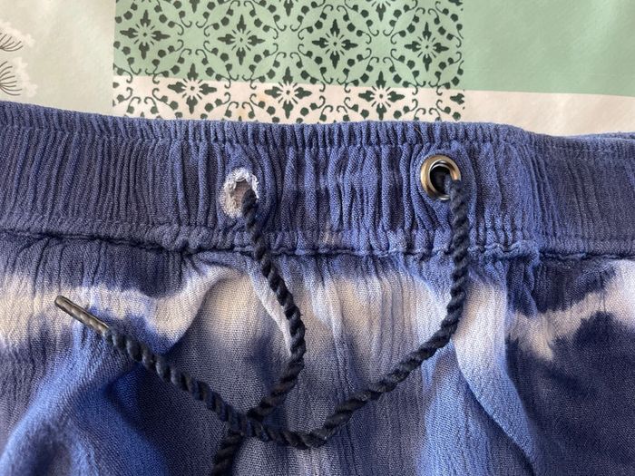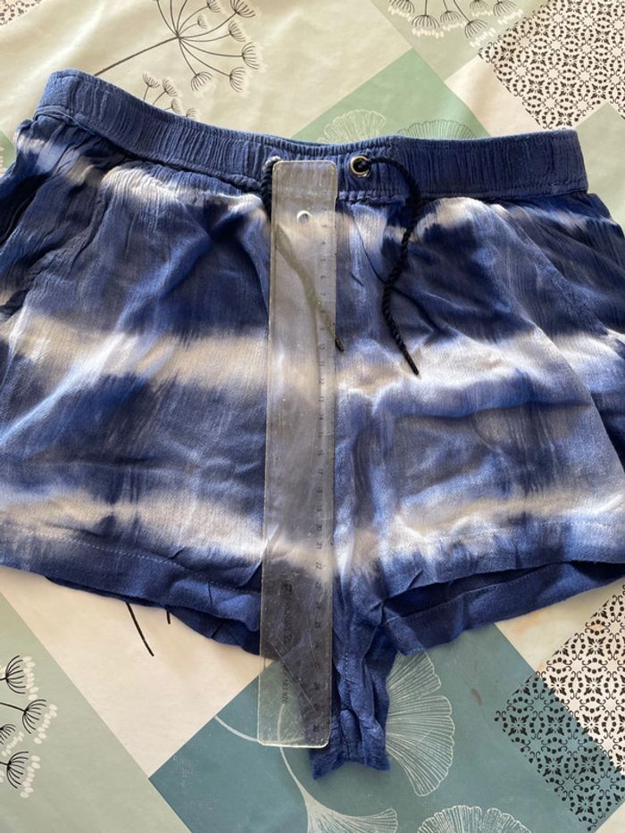 Short bleu/blanc aspect délavé Marque Tissaia Tour taille 32cm et élastique Longueur maxi 33cm Taille XS Manque rond métallique au niveau de la ceinture (cf dernière photo) 2 poches devant et 2 derrière
