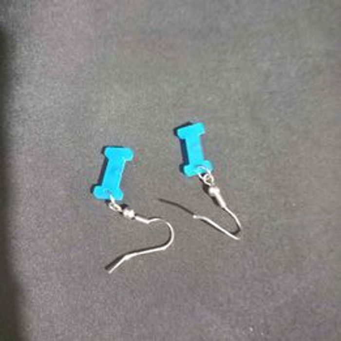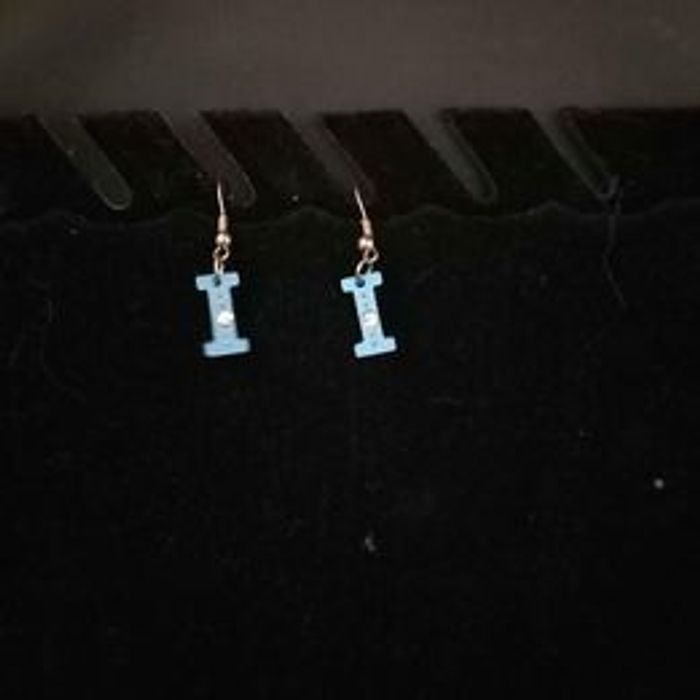Boucles d'oreilles femme Matières métal, strass et plastique Forme lettre i Couleurs argenté et bleu Fermoirs crochets En très bon état Dimensions approximative : 3,5cm de long - 0,8cm de large