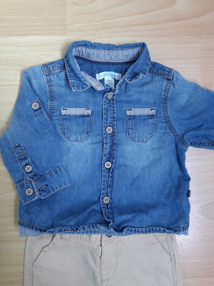 Ensemble deux pièces : 1 chemise en jeans Obaïbi 6 mois TBE 1 pantalon beige ceinture réglable TAO 6 mois TBE Le tout en très bon état. Possibilité de vendre séparément