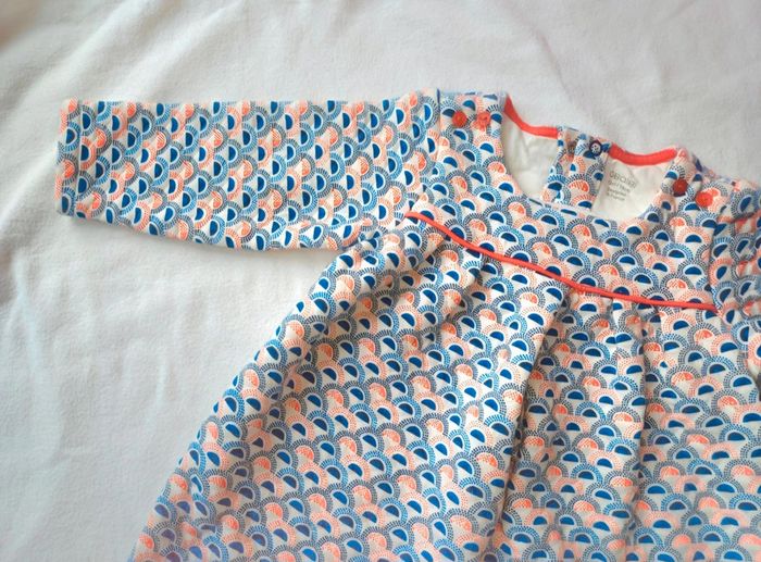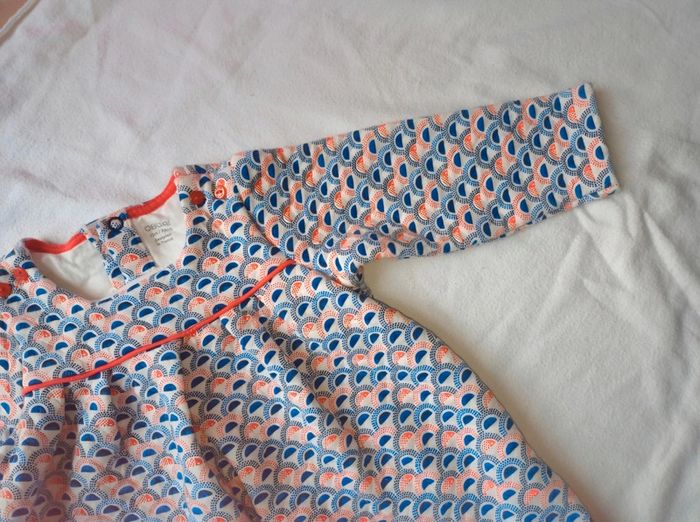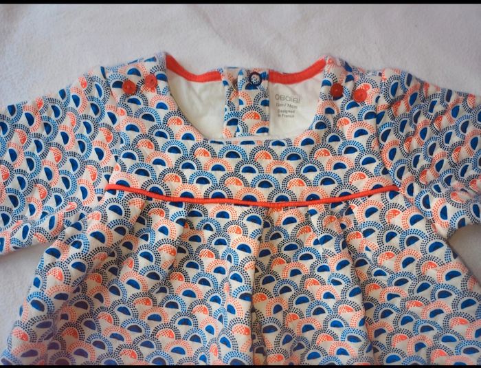 Vends Robe Blanche avec motifs rouge et bleu Ouverture dans le dos par pressions Et un gilet rouge Ouverture par pressions Marque : obaibi Taille 12 mois L'ensemble en excellent etat Prix : 9 euros Maison non fumeur et sans animaux
