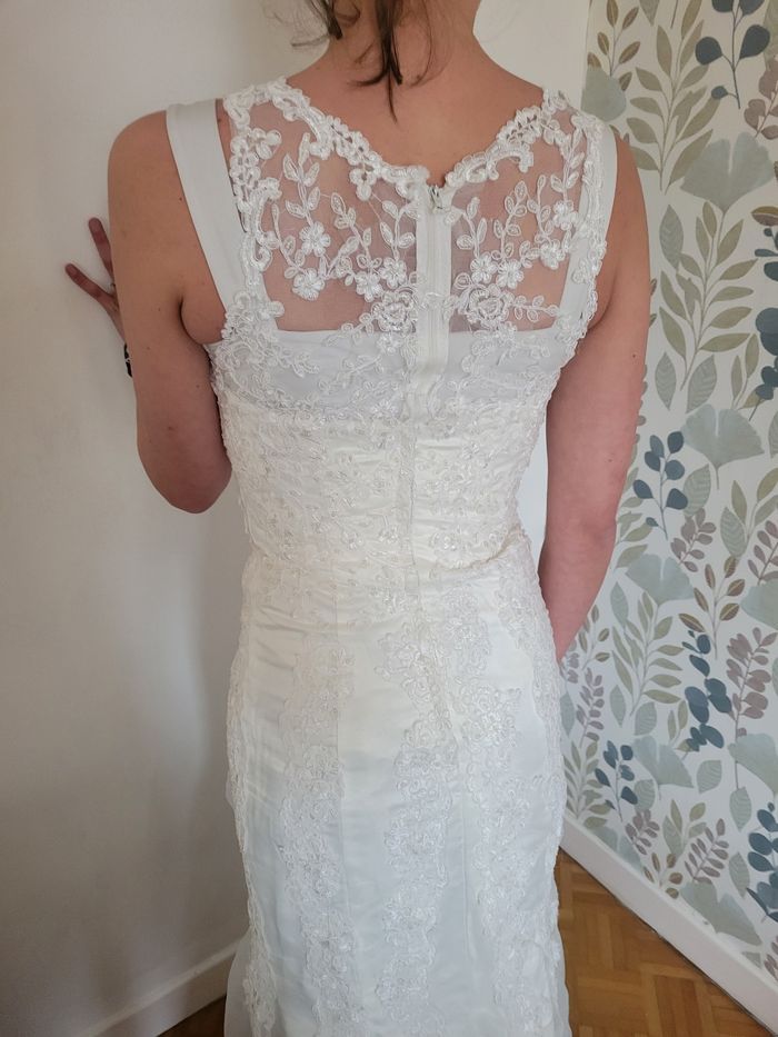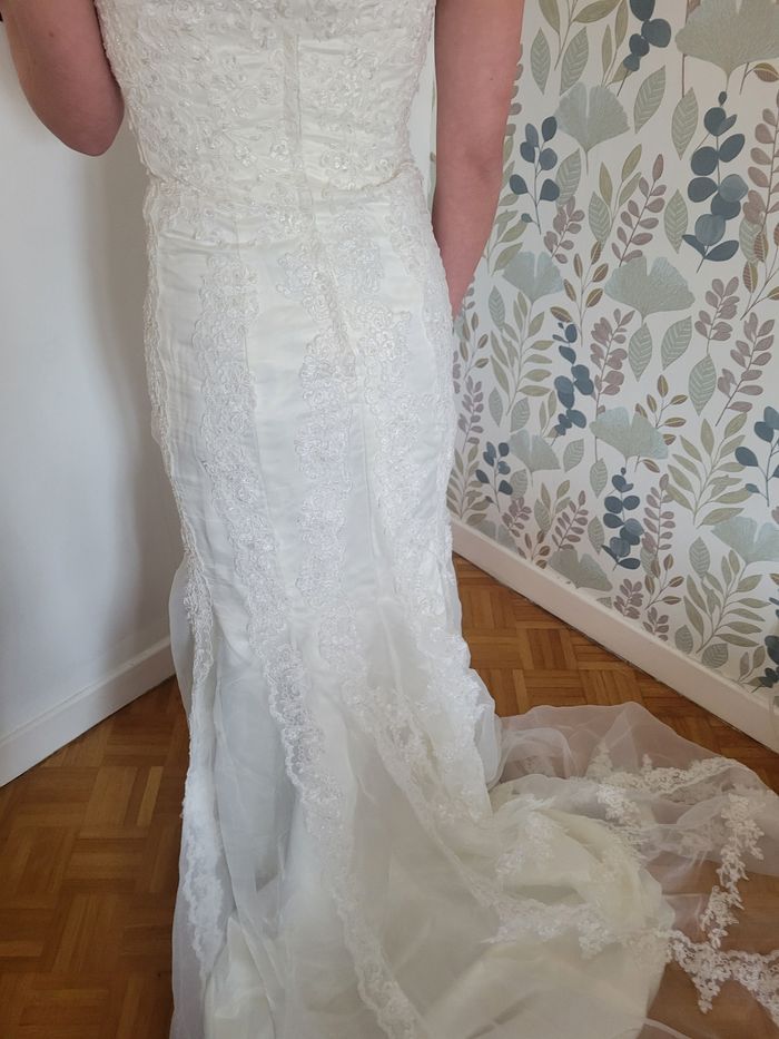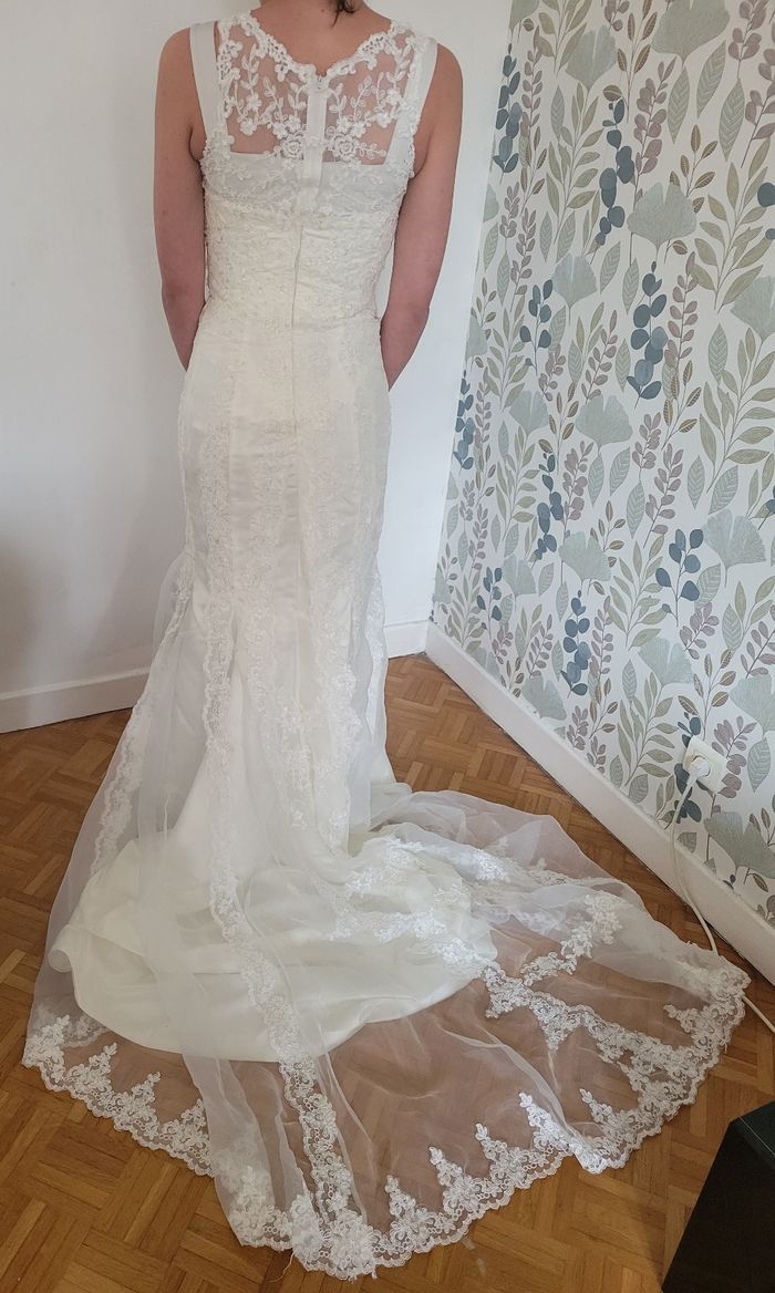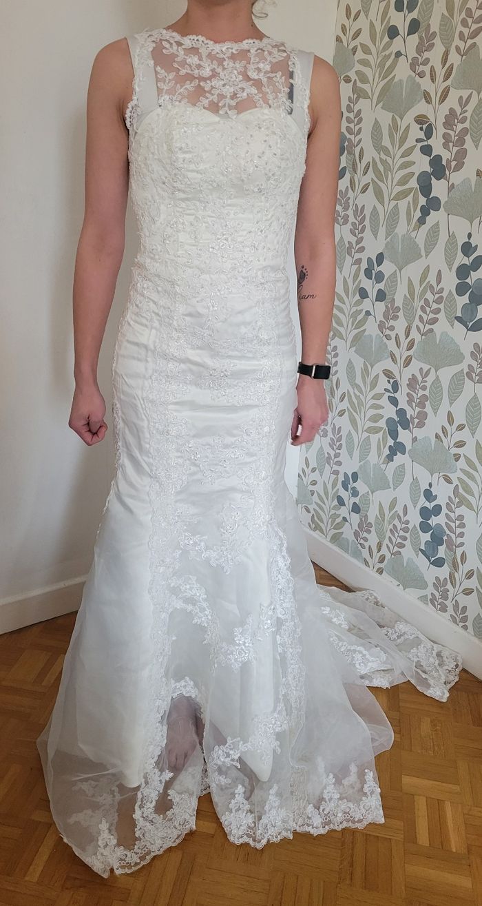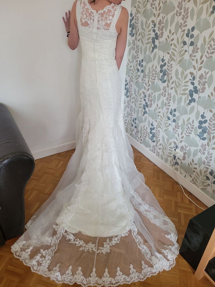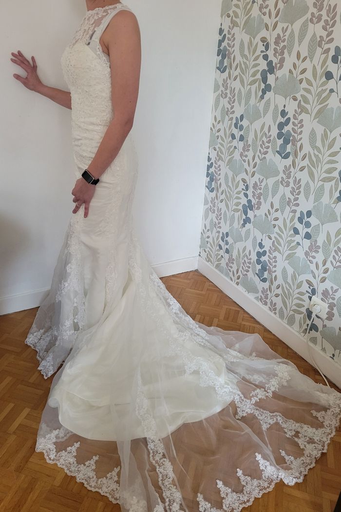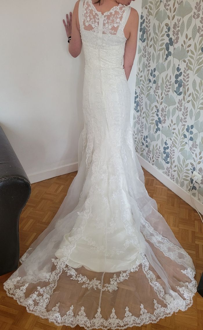 Robe de mariée style sirène avec une traîne à l'arrière Correspond à un 34/36, la robe se ferme entièrement dans le dos. Le mannequin est plus large que la robe pour pouvoir le fermer