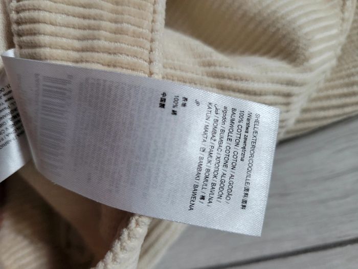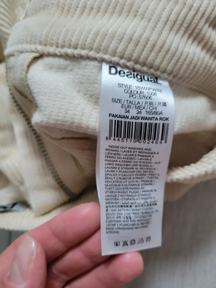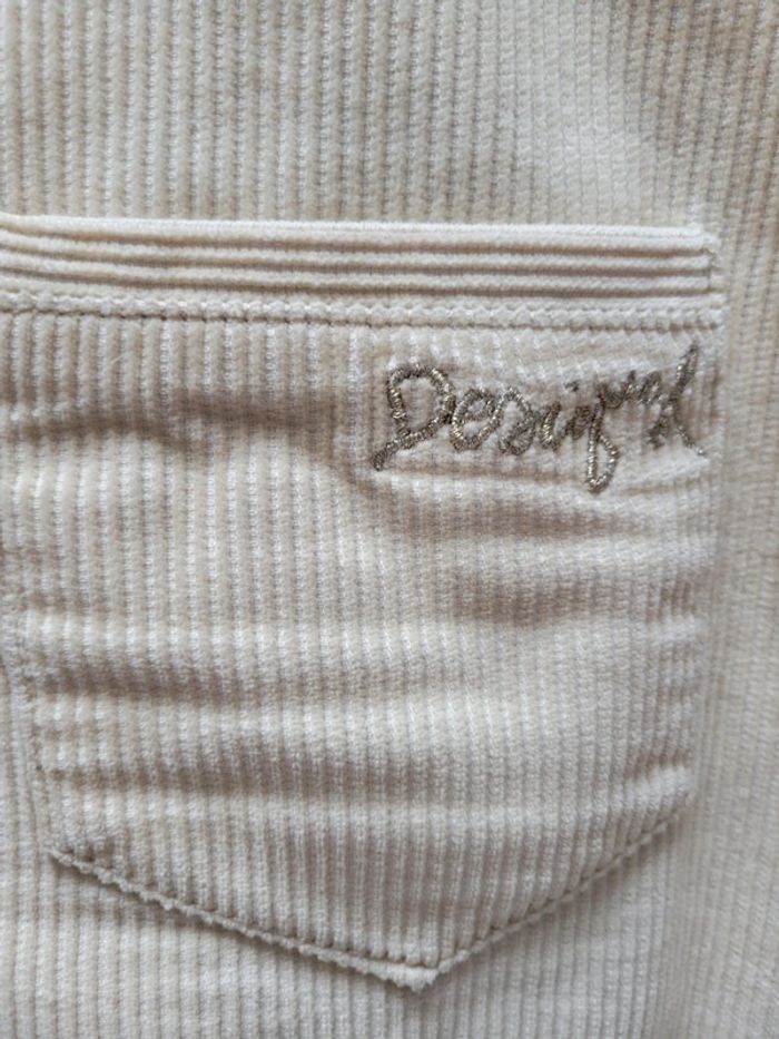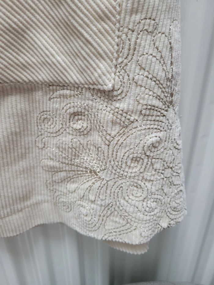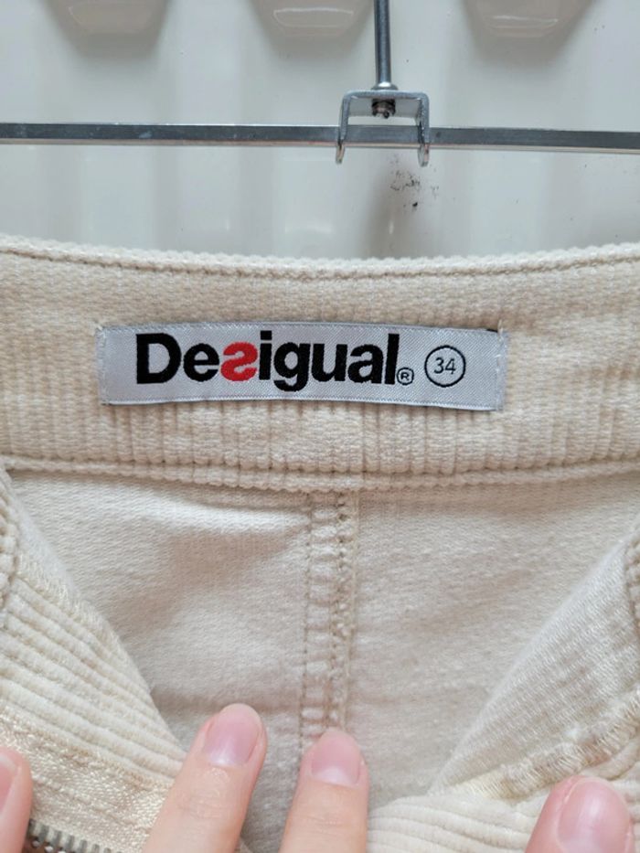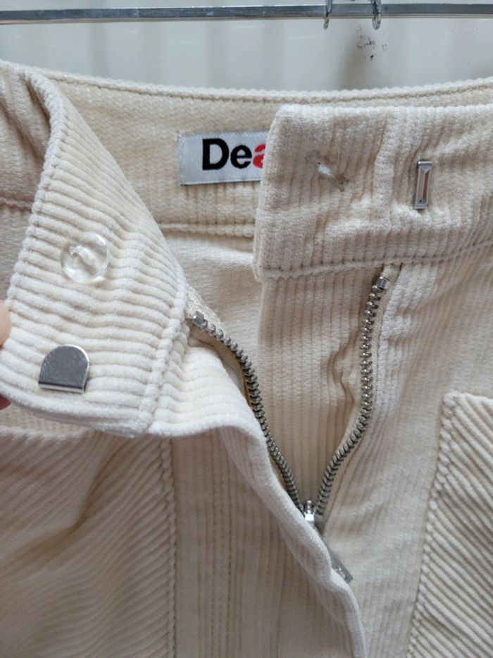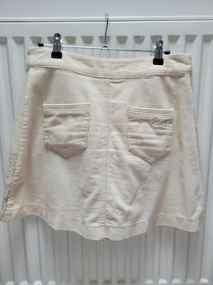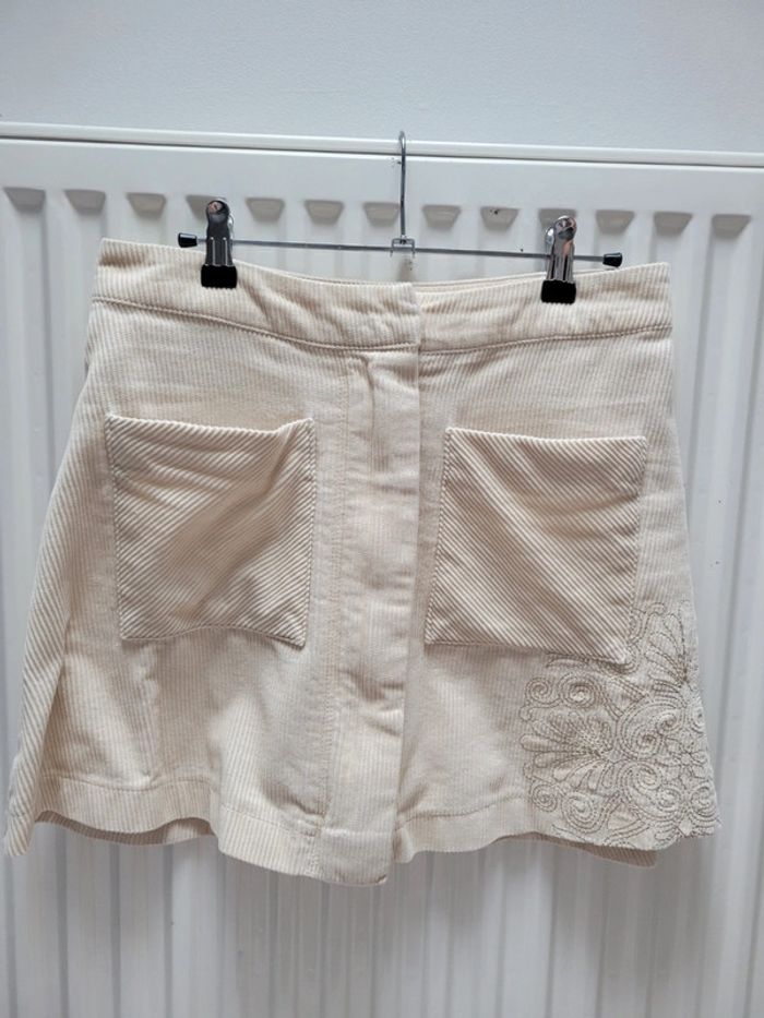 Jupe velours beige courte (au-dessus des genoux), avec dessin en couture dorée 2 poches avant, 2 poches arrière. Fermeture sur toute la hauteur + agrafe et bouton au niveau de la taille Taille 34 mais taille grand, correspond plutôt à un 36, voire petit 38 Très bon état