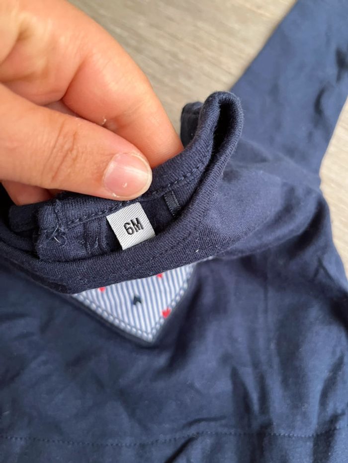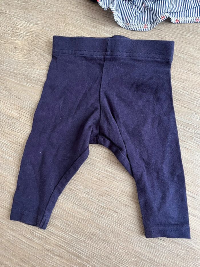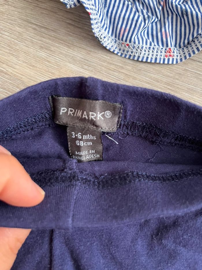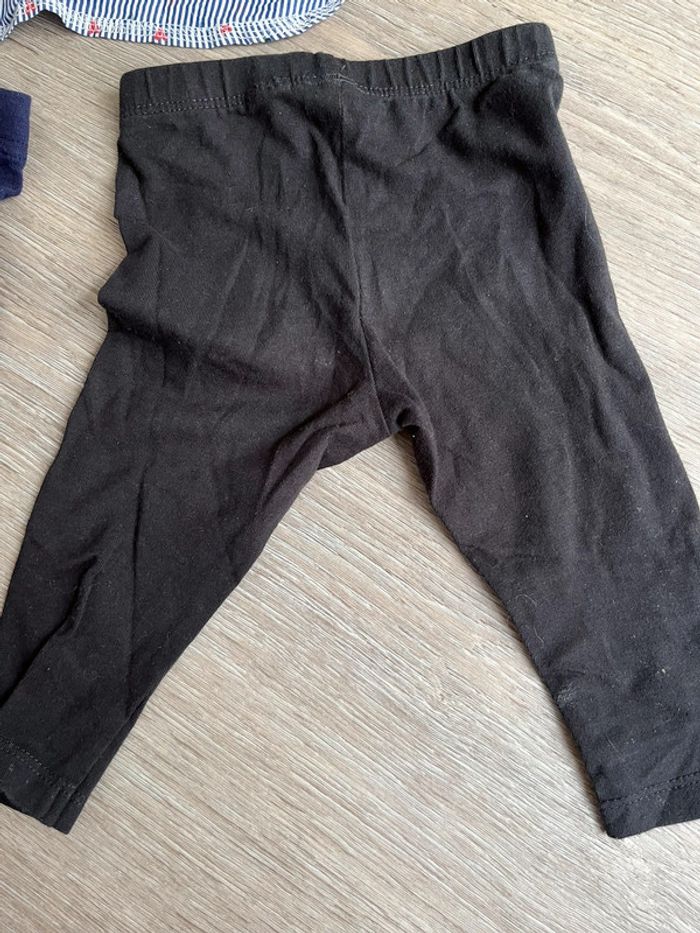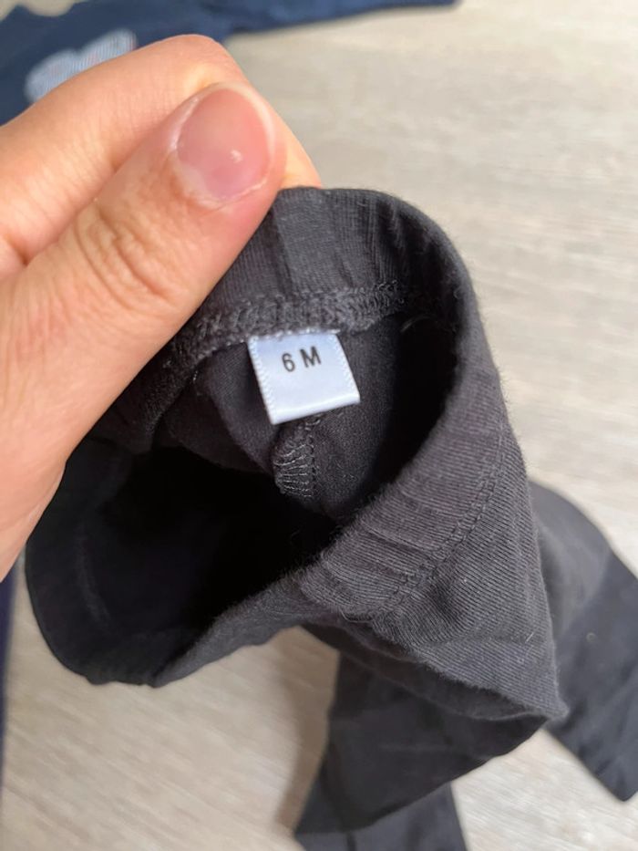 Je ne sais pas la marque du pull ni du legging noir mais c’est du 6 mois. Le legging bleu est un Primark 3/6 mois