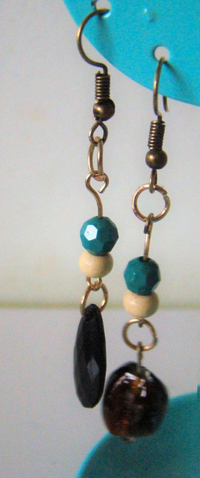 BOUCLES OREILLES pour oreilles percées - pendantes FANTAISIE avec perles ivoire - turquoise et la plus grosse ambre jamais portées NEUVES de ma création longueur 6 cms - avec embout pour ne pas les perdre