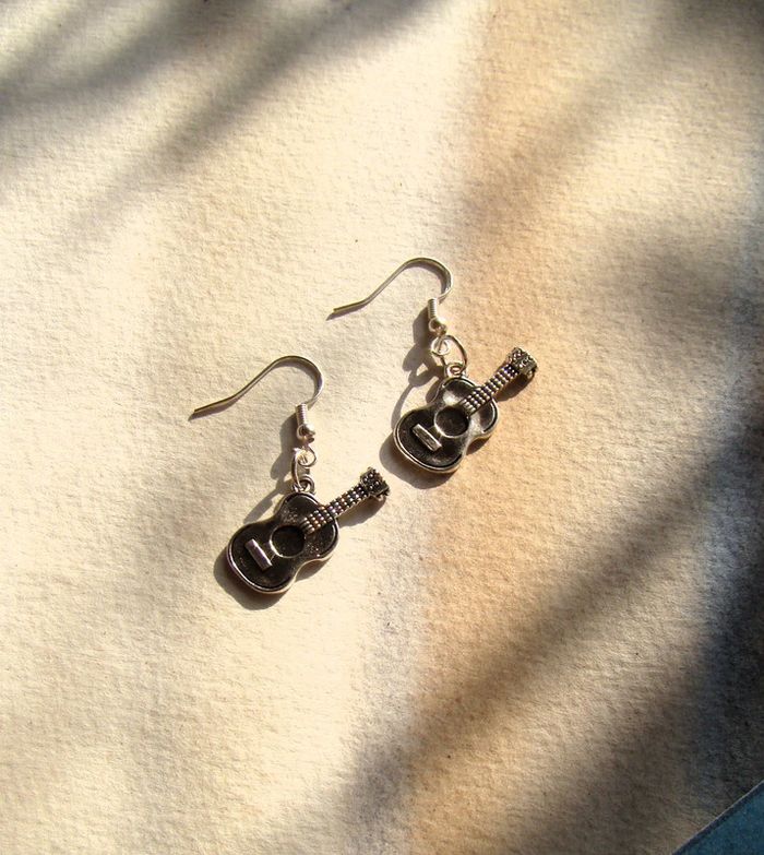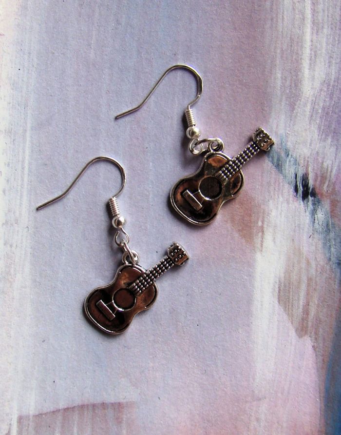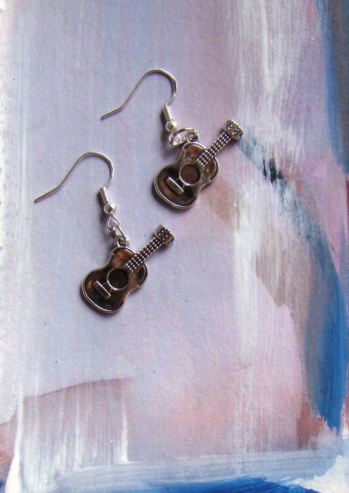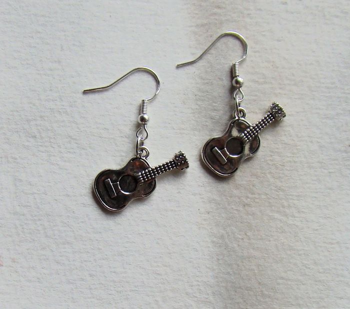 boucles oreilles musique guitares - ma Création donc jamais portées -crochets argent poinçonné 925 matériel hypoallergénique pour éviter les allergies embouts transparents pour ne pas les perdre