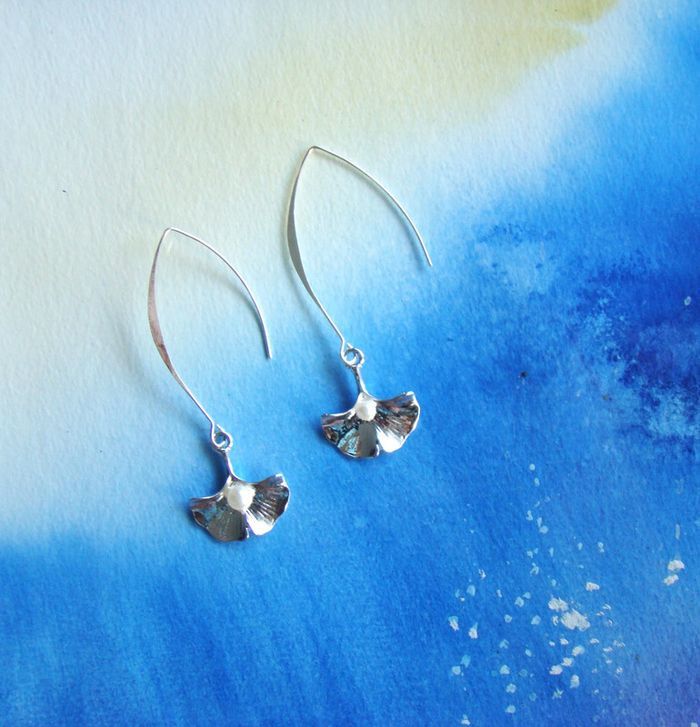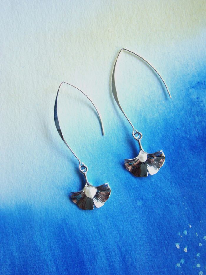 boucles oreilles fleur de ginko- grands crochets argent poinçonné 925 modèle jamais porté ma Création hauteur 7 cms perle sur le ginko crochets en argent et embouts pour ne pas les perdre matériel hypoallergénique