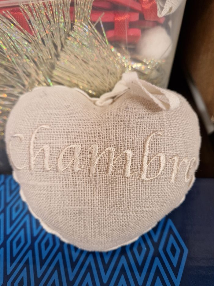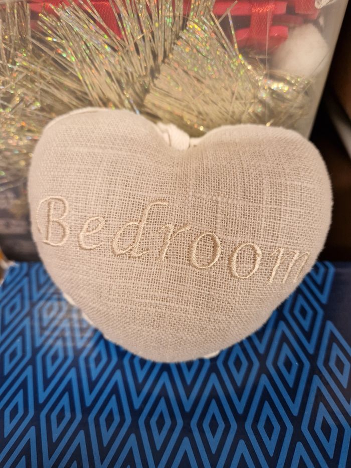 Bonjour Je vends ce coussin de porte Forme cœur Marquer d'un côté chambre de l'autre kitchen En très bon état Je vends d'autres modèles N'hésitez pas à faire un lot dans mon dressing Cordialement