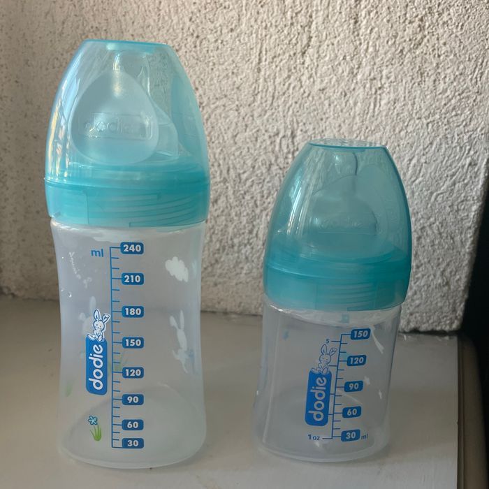 Je vend - 4 biberons dodie de 240 ml et - 3 biberons dodie de 150 ml Avec tétine débit 1 nettoyer et très peu utiliser
