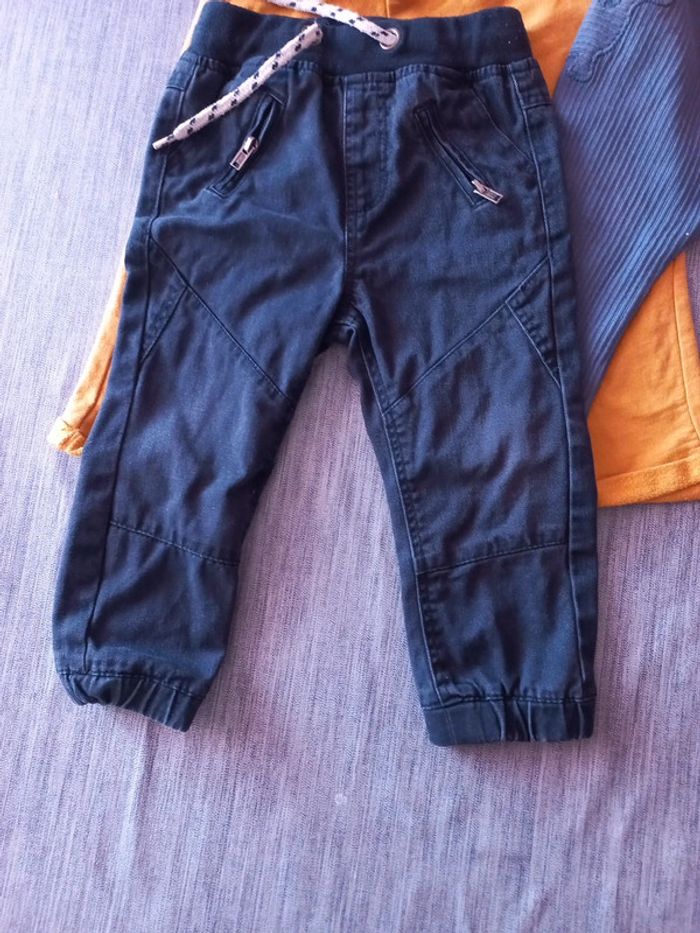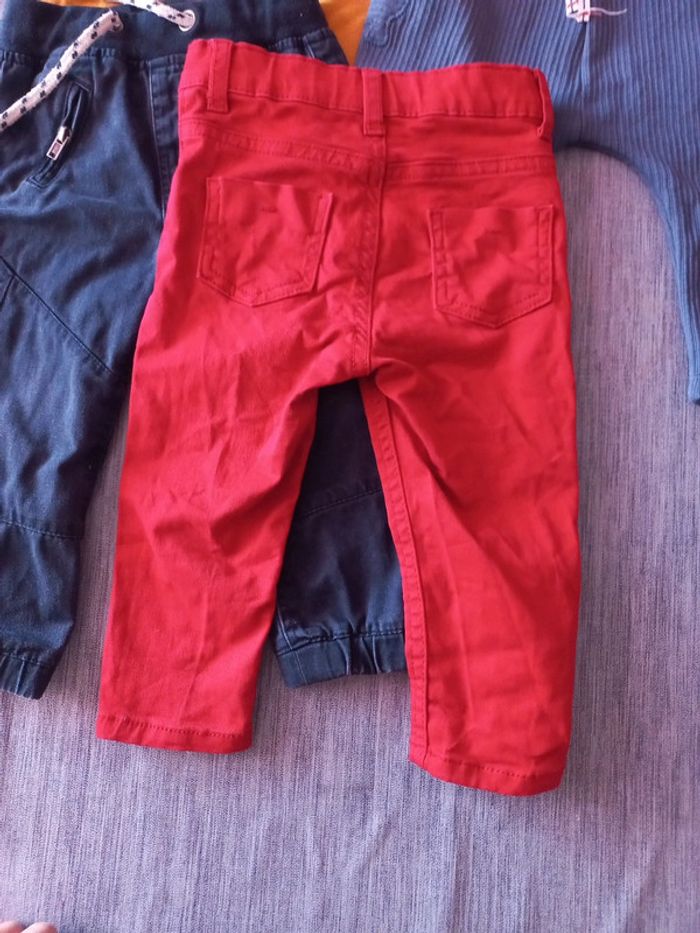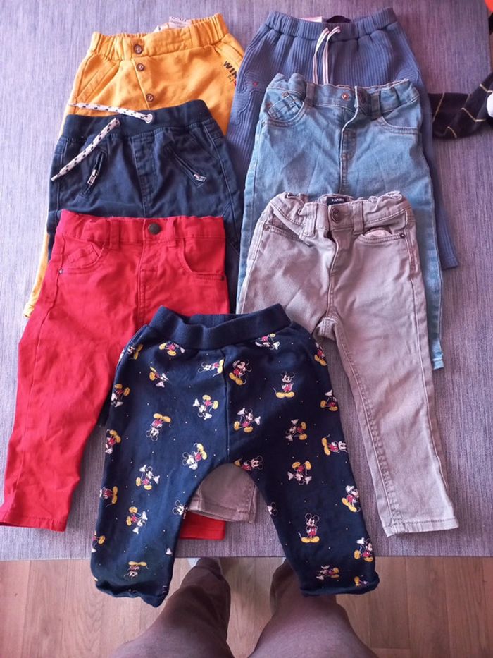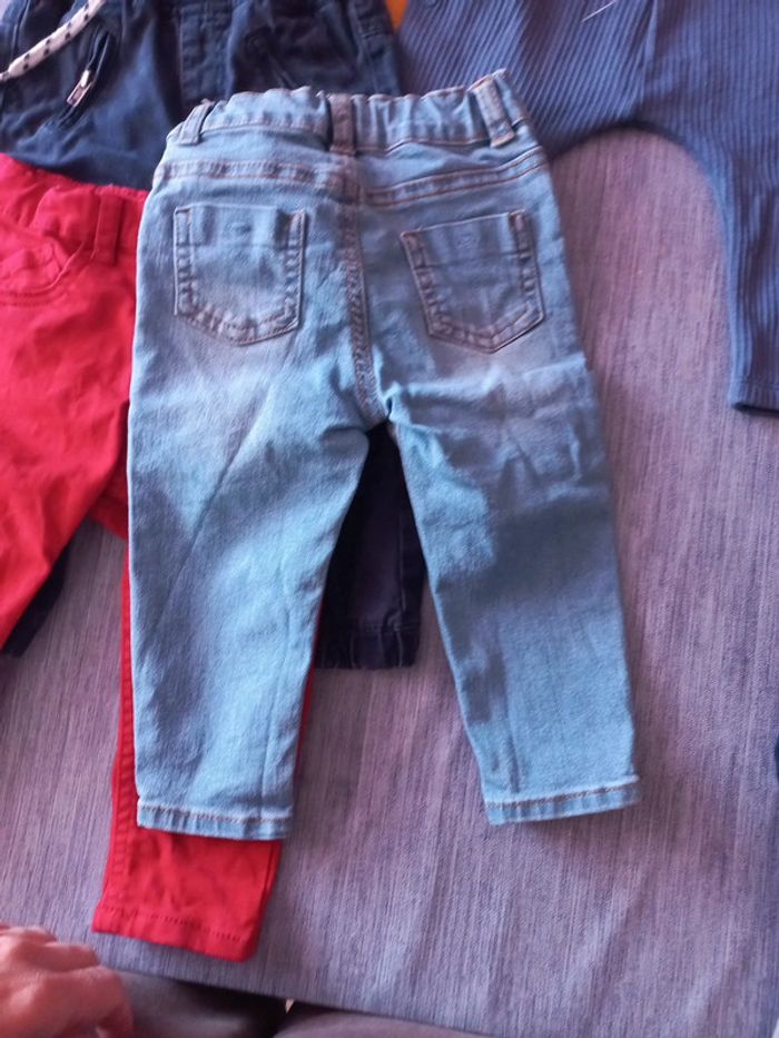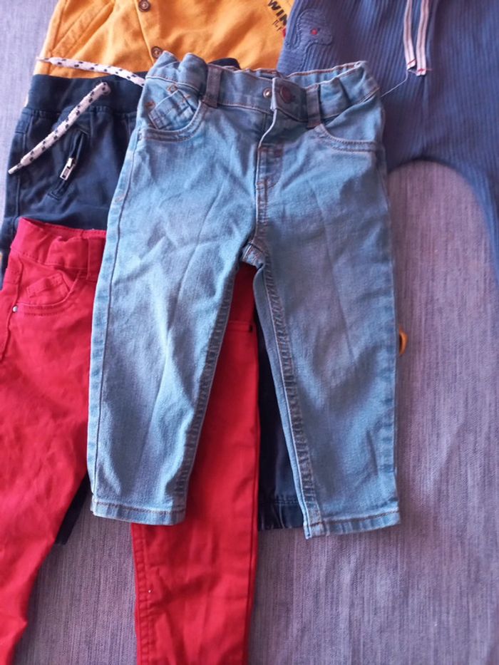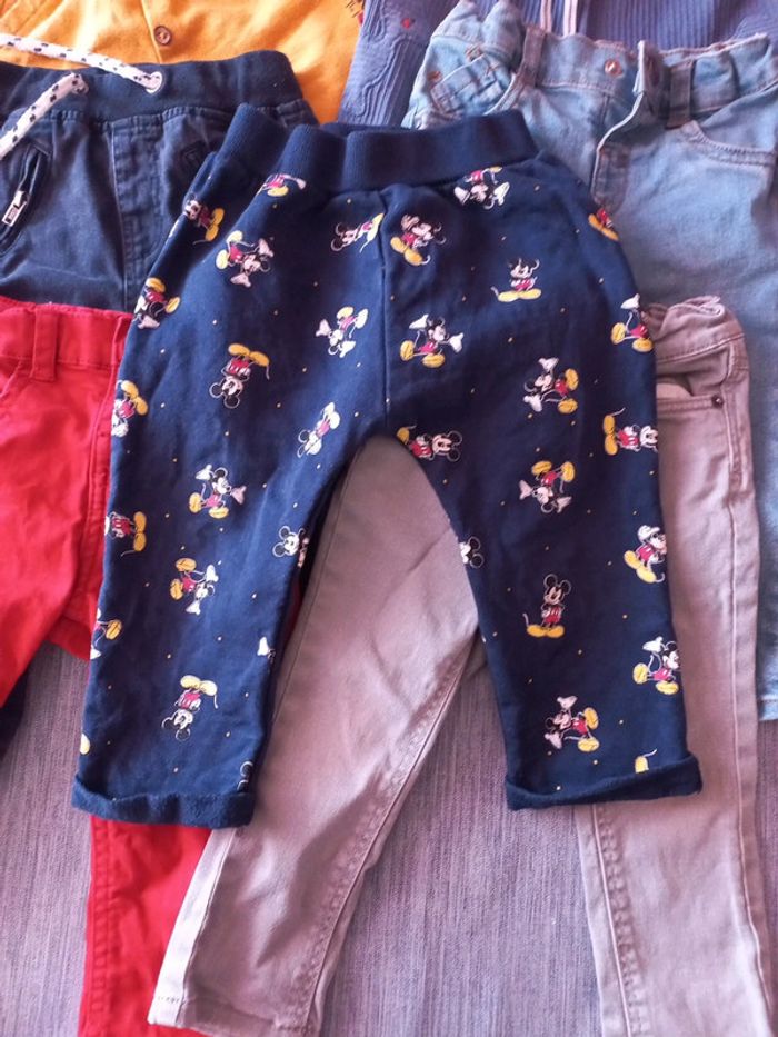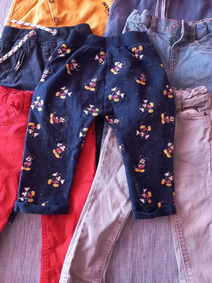 1 jogging bleu marine imprimé Mickey disney baby 1 jean gris kiabi skinny fit 1 jean clair kiabi 1 jean rouge 1 pantalon élastique à la taille et aux chevilles kiabi 1 sarouel bleu avec petits dinosaures sergent major 1 jogging sarouel moutarde winnie l'ourson disney baby usure aux genoux #lenkekepetitcoeur18mois