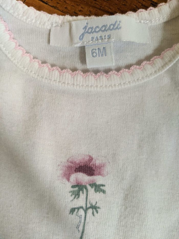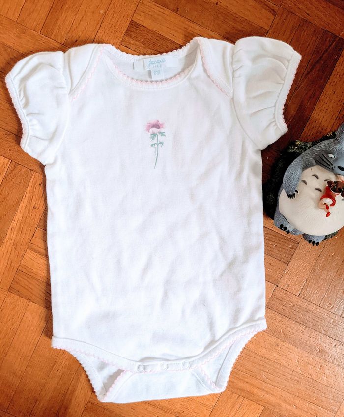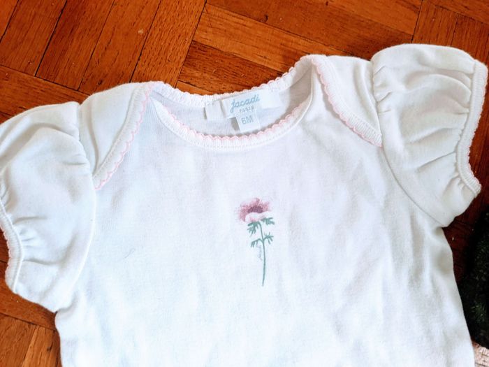 Body coton blanc épais festons dentelle rose Jacadi 6 mois Neuf jamais porté Jolie fleur devant Manches courtes 6 mois Jacadi #yipin_bebe_6mois_fille