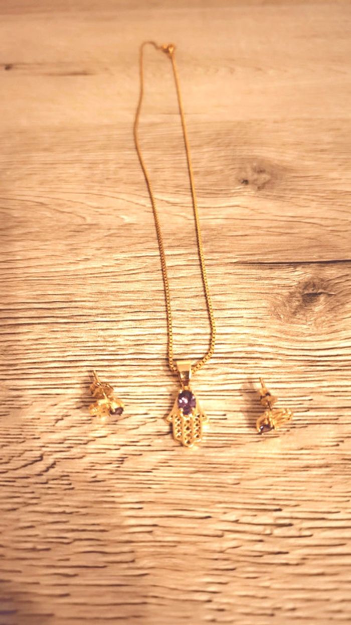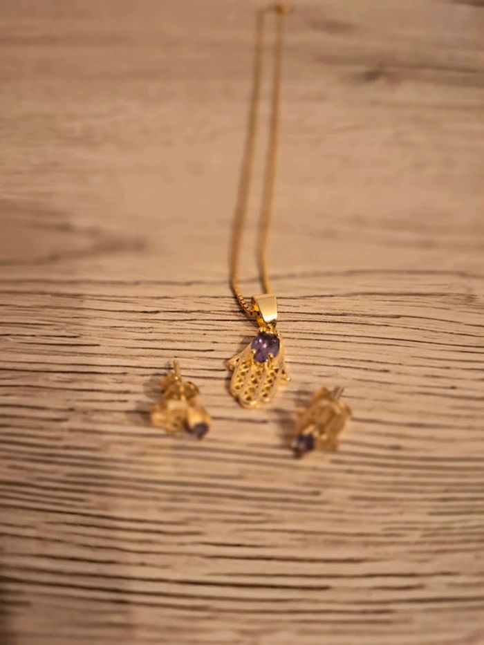 Très belle parure de bijoux avec mains avec une perle mauve Il y a la chaîne et 2 boucles d'oreilles Vente cause allergie Maison non fumeur #sandrapriscilliabijoux