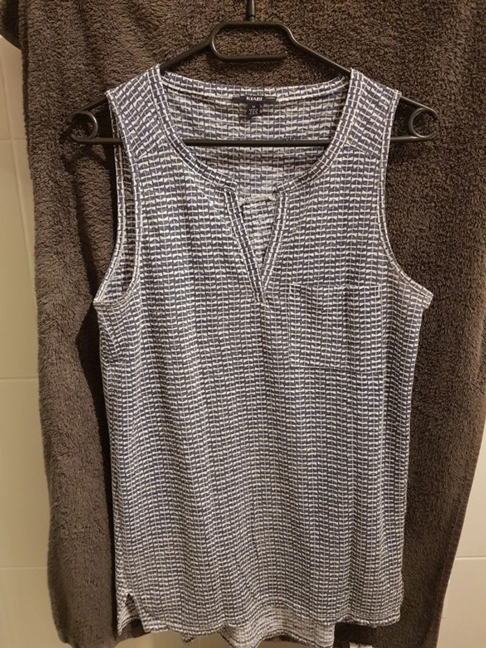 Débardeur blanc et bleu avec motifs. Taille M, marque Kiabi.