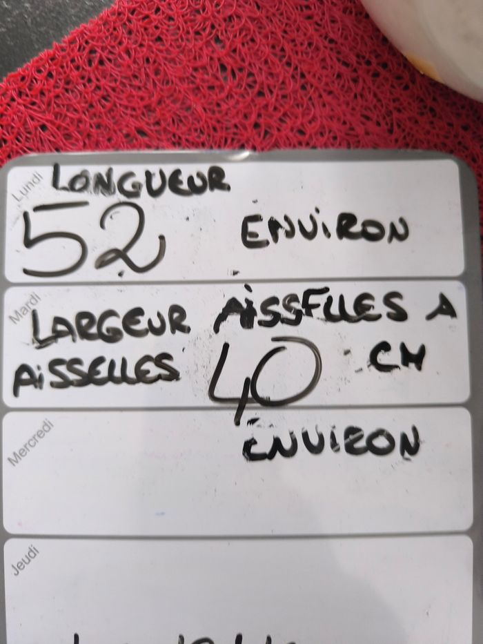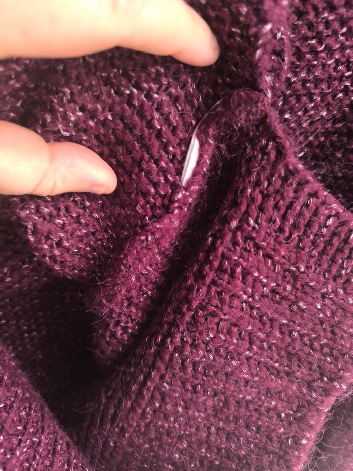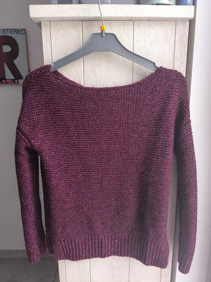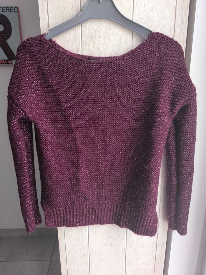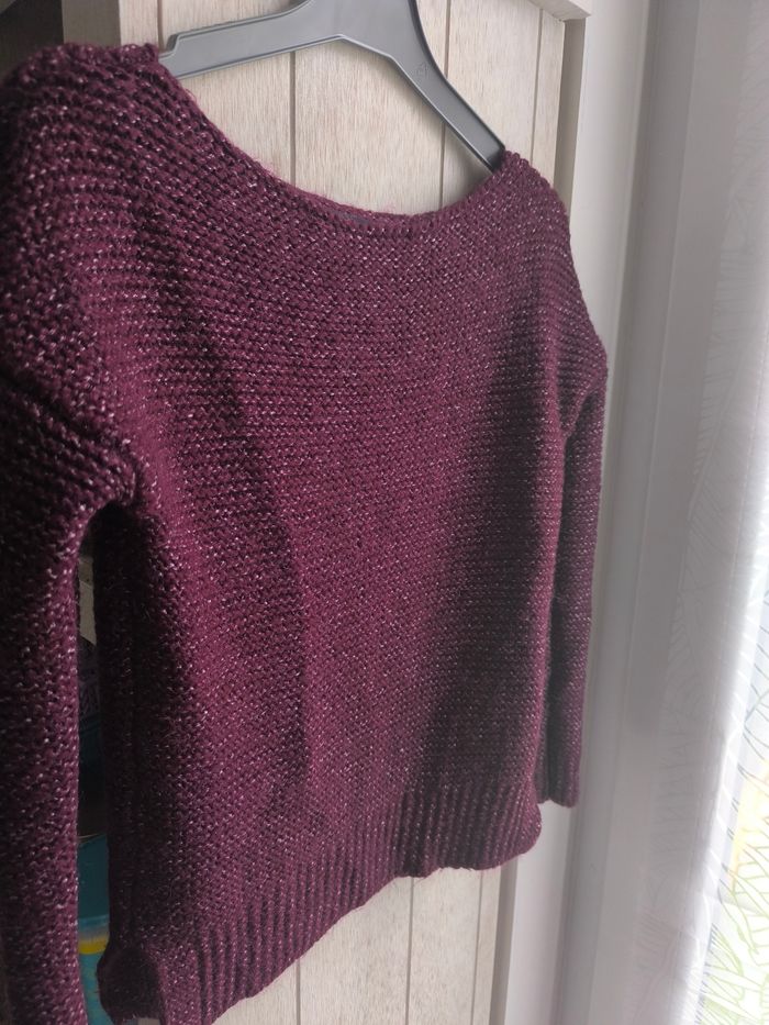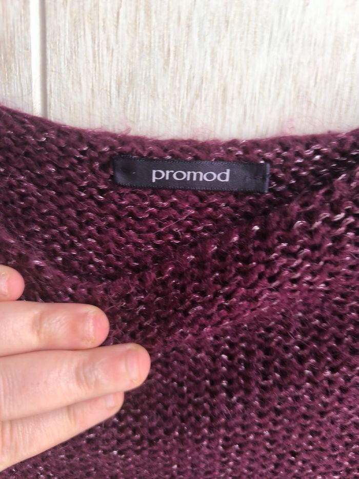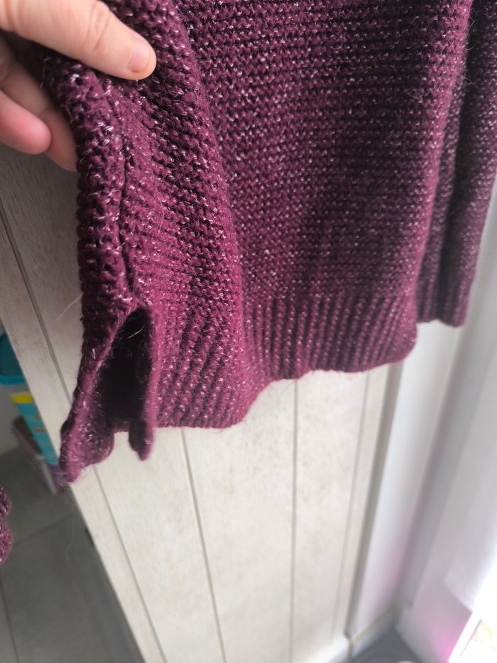 Marque:Promod Couleur: Prune fil argenté Matière:Je ne sais pas étiquette coupée Taille:Je ne sais pas étiquette coupée, mensurations en photo pas de photos portées je ne rentre pas dedans Etat: Très bon état peu porté