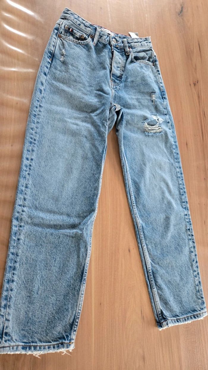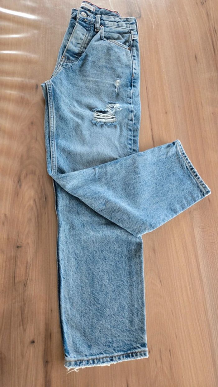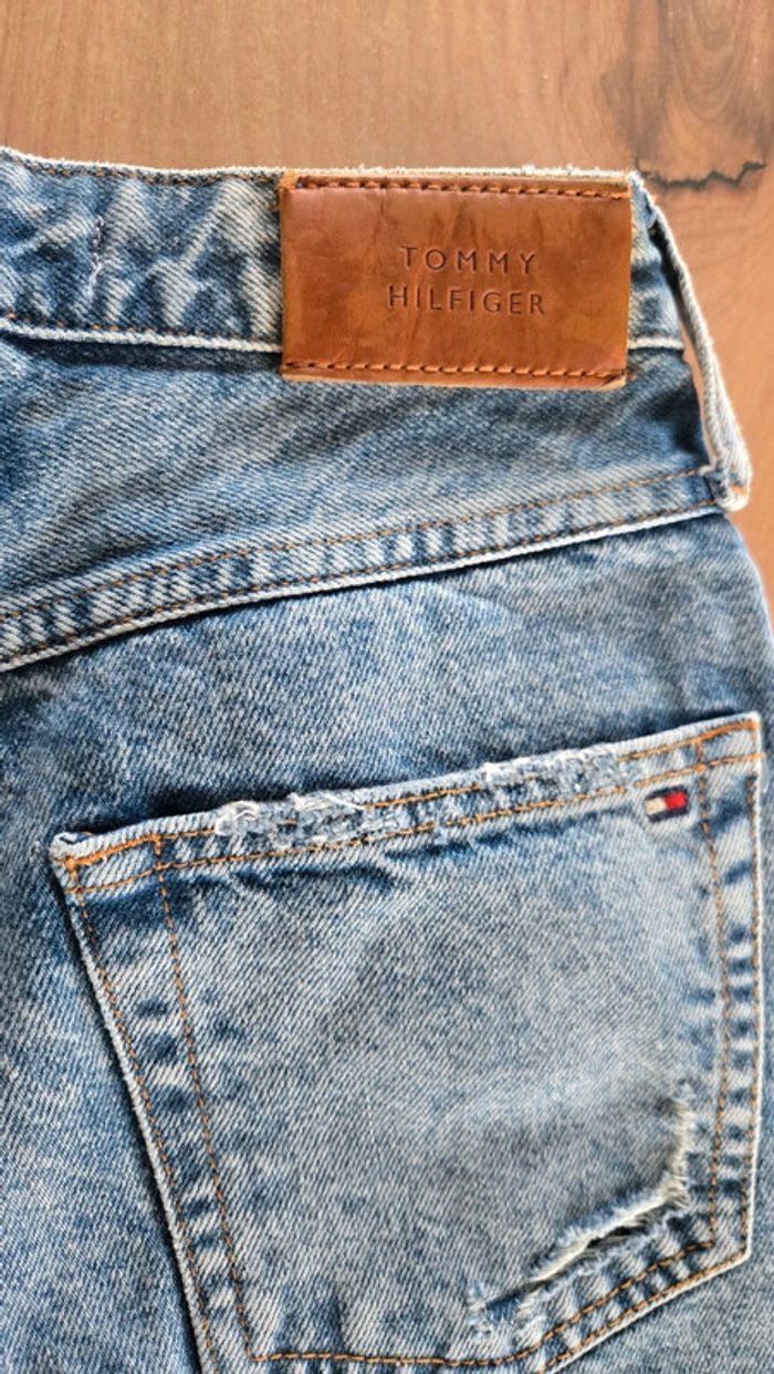 Jeans Tommy Hilfiger coupe staight ankle. Taille 25x28. Effet usé sur les poches arrières en en bas des jambes. Trou sur cuisse droite. Jamais porté. Prix d'achat 149,99