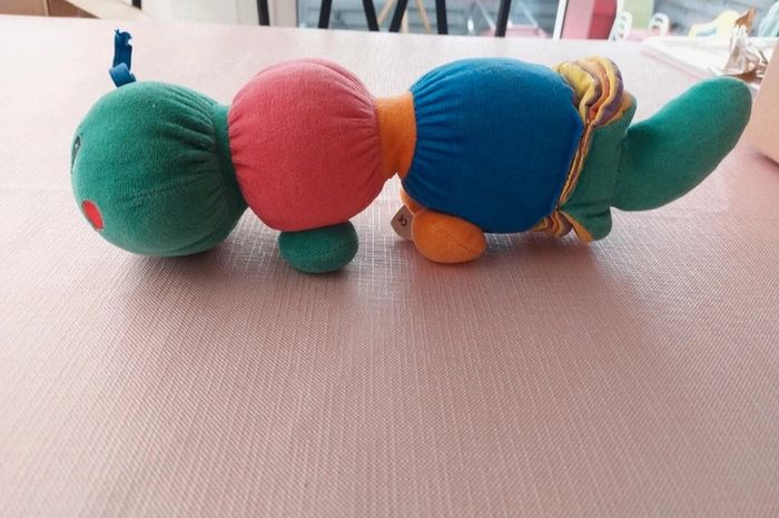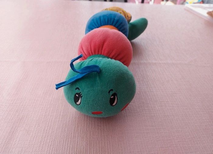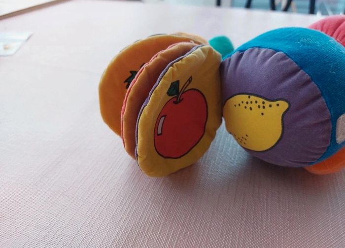 Peluche mille-pattes sensorielle. Quand on la secoue fait un bruit de cresselle. La queue fait un bruit de papier froissé quand on.la touche et quand on l ouvre il y a des images de fruit.