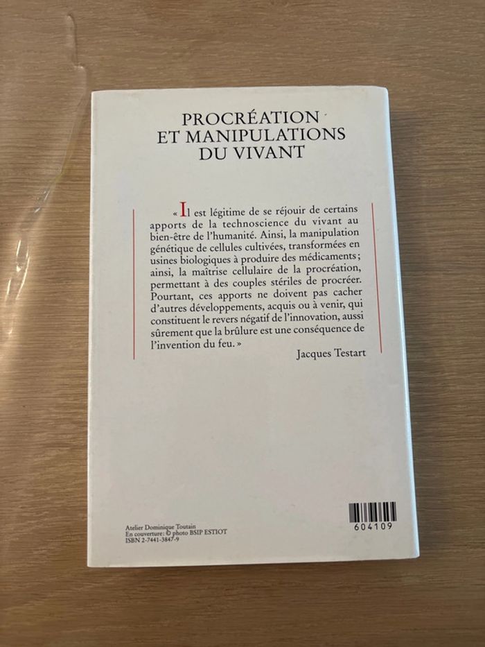 « Il est légitime de se réjouir de certains apports de les technoscience du vivant au bien-être de l’humanité. Ainsi, la manipulation génétique de cellules cultivées, transformer en usine biologique à produire des médicaments ; ainsi, la maîtrise cellulaire de la procréation, permettant à des couples stériles de procréer. Pourtant, ces apports ne doivent pas cacher d’autres développement, acquis ouà venir, qui constitue le revers négatif de l’innovation, aussi sûrement que la brûlure est c’est plus une conséquence de l’invention du feu. Question de société France-Loisirs Jacques Testart