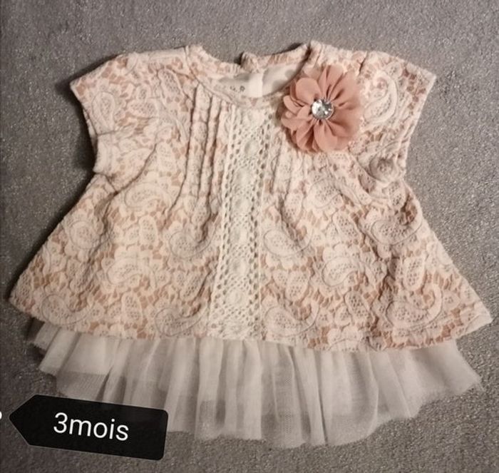Robe dentelle Marque :Pippa Julie Doublure /et dentelle Manche courte Taille : 3mois Couleur : marron clair / blanc Portée une fois, aucune tache 6€.