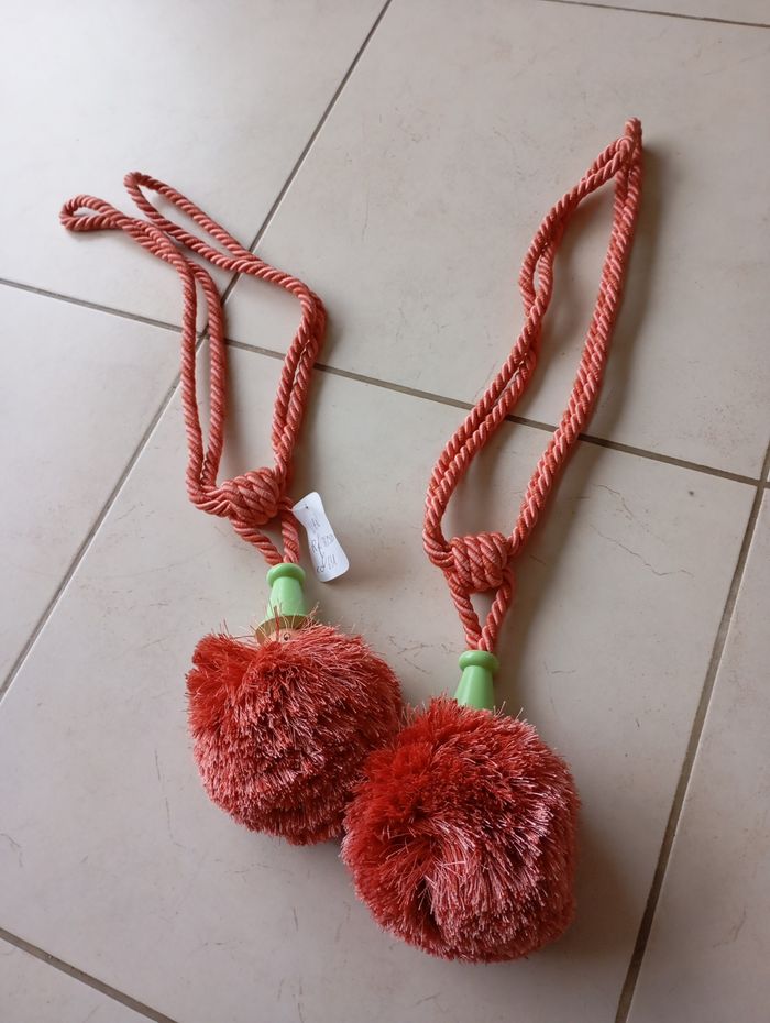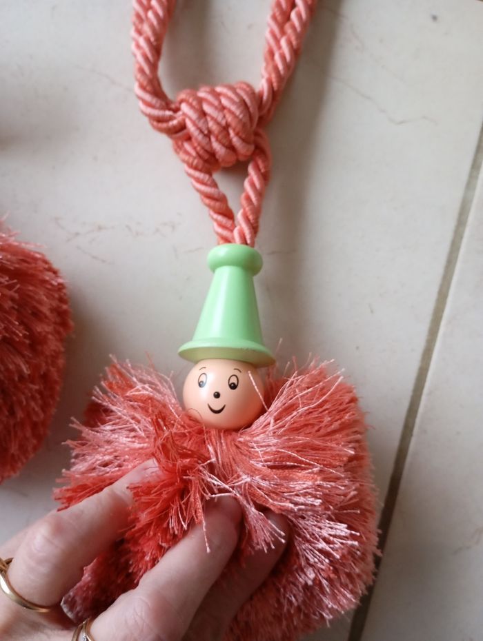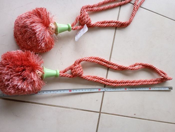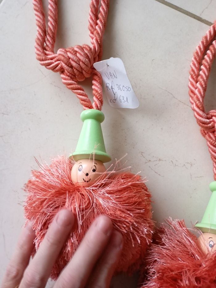 2 Attaches de rideaux embrasses neuves Étiqueté Couleur saumon chapeau vert clair Au bout un très gros pompon très doux et dessus une tête et chapeau de petit bonhomme rigolo Neuf jamais mis Longueur voir photo