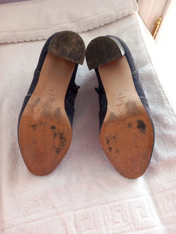Belles chaussures fermées avec fermeture éclair sur le côté aspect daim + petite perle sur le devant semelle impeccable tres un peu servi talon 8 cm de hauteur