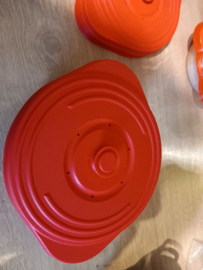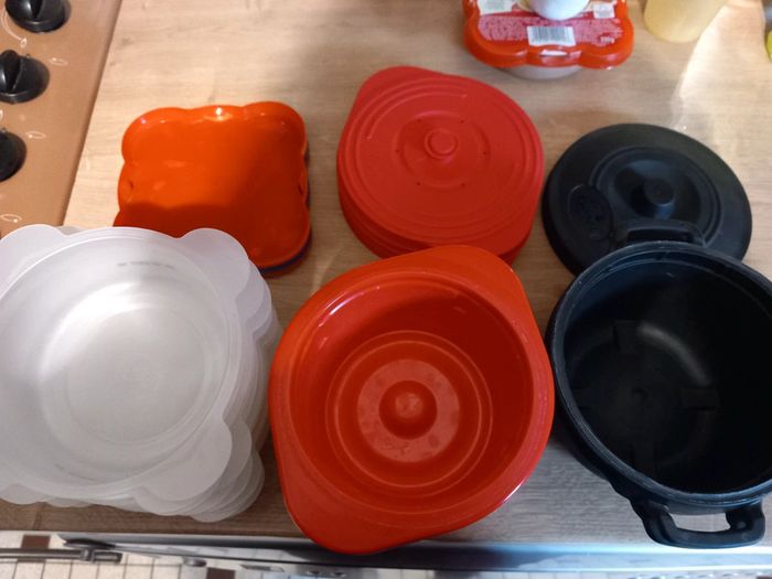 10 assiette au couvercle bleu 250 ml 4 assiette bol rouge 400 ml 2 assiette.bol noire 500 ml Tous avec couvercle..va du congélateur au micro-ondes