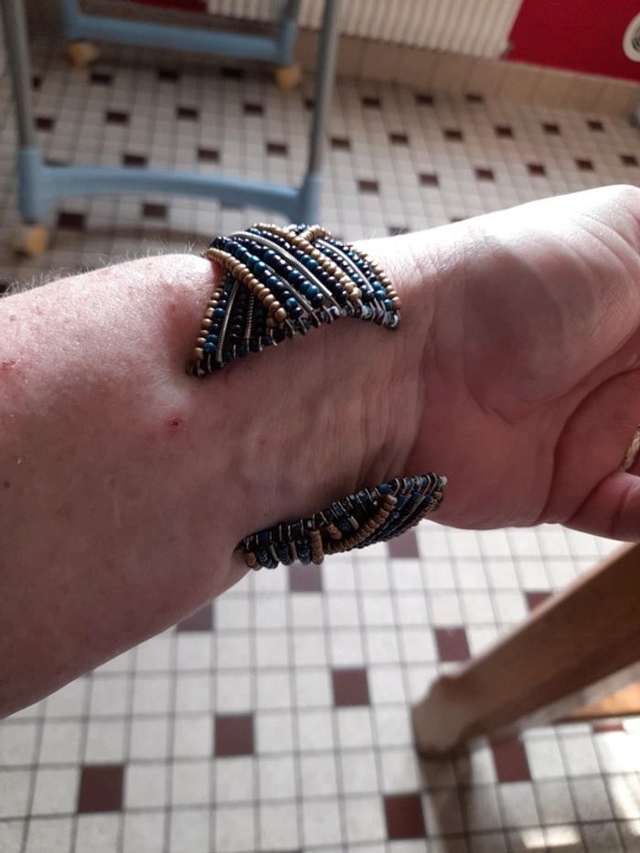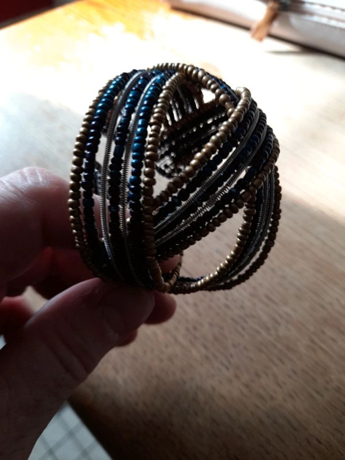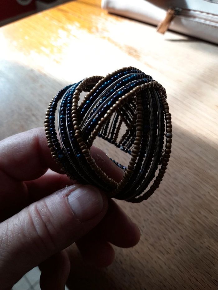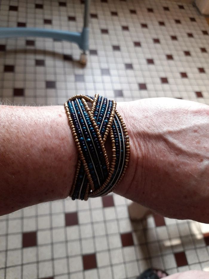 Idée cadeau.. Neuf ds son étui Bracelet à perle bleu noir doré.. Qui ne se ferme pas .. Pratique pour youte grandeur de poignet