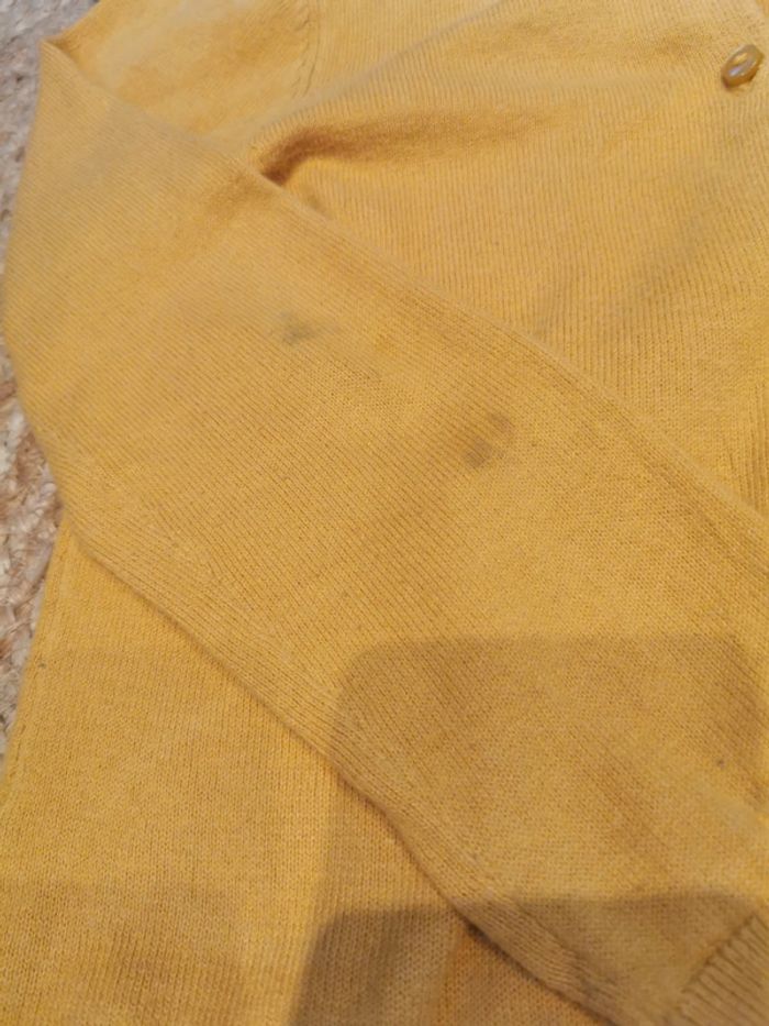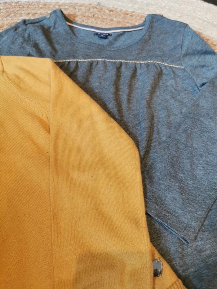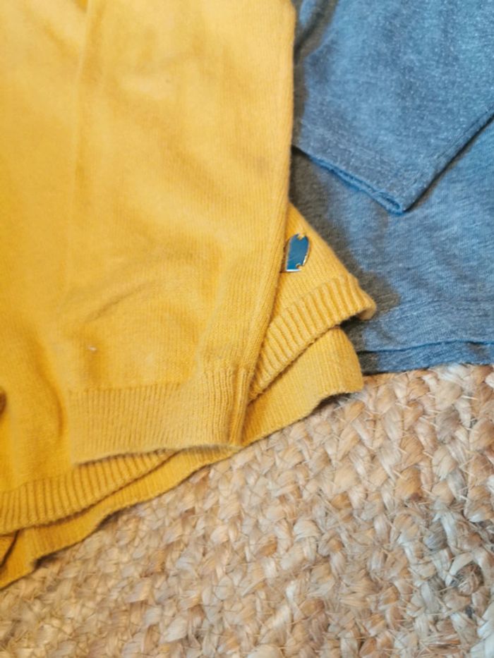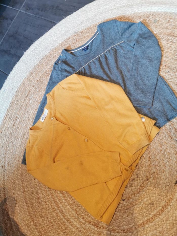 Ensemble gilet t shirt h&m kiabi 6ans moutarde Gilet h&m moutarde a boutons reverd de la manche tâché voir photo seul défaut je nai pas essayé d'enlever plus que ça petit prix T shirt manche longue gris bande doree kiabi 6 ans
