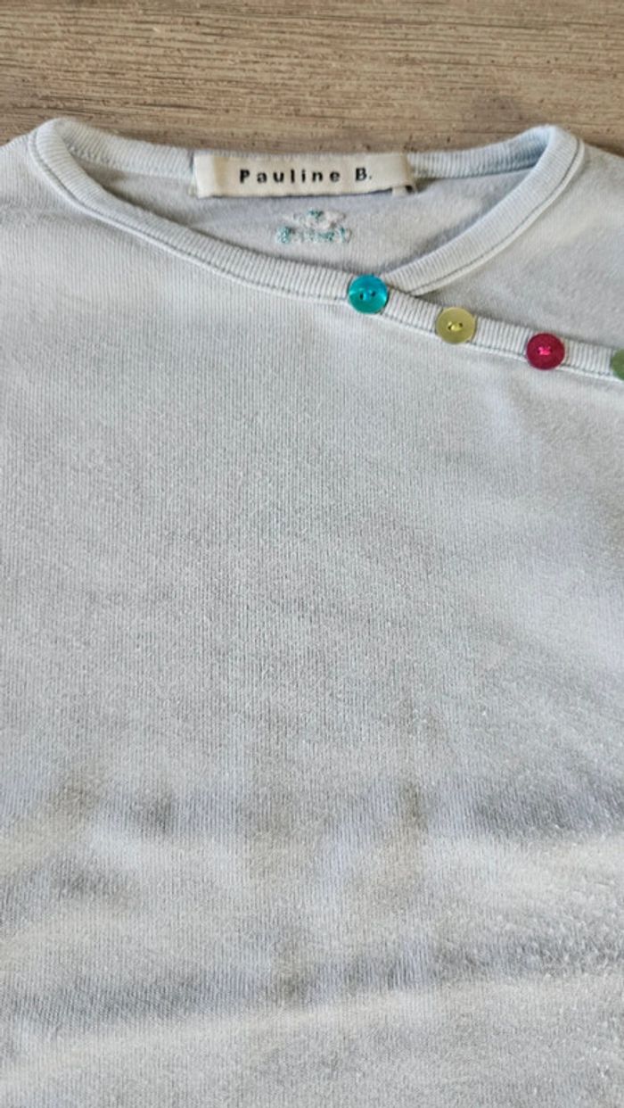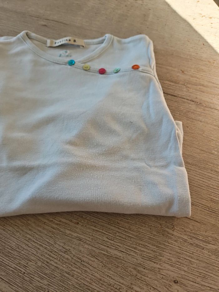 T shirt à col rond avec boutons décoratifs de couleur. Bleu très clair. Peu mis mais attnetion, un endroit, un peu en dessous des boutons, comme des micro bouloches, ce n est pas visible quand il est porté. Convient bien pour du 7 à 8 ans #deborahtock_8ans