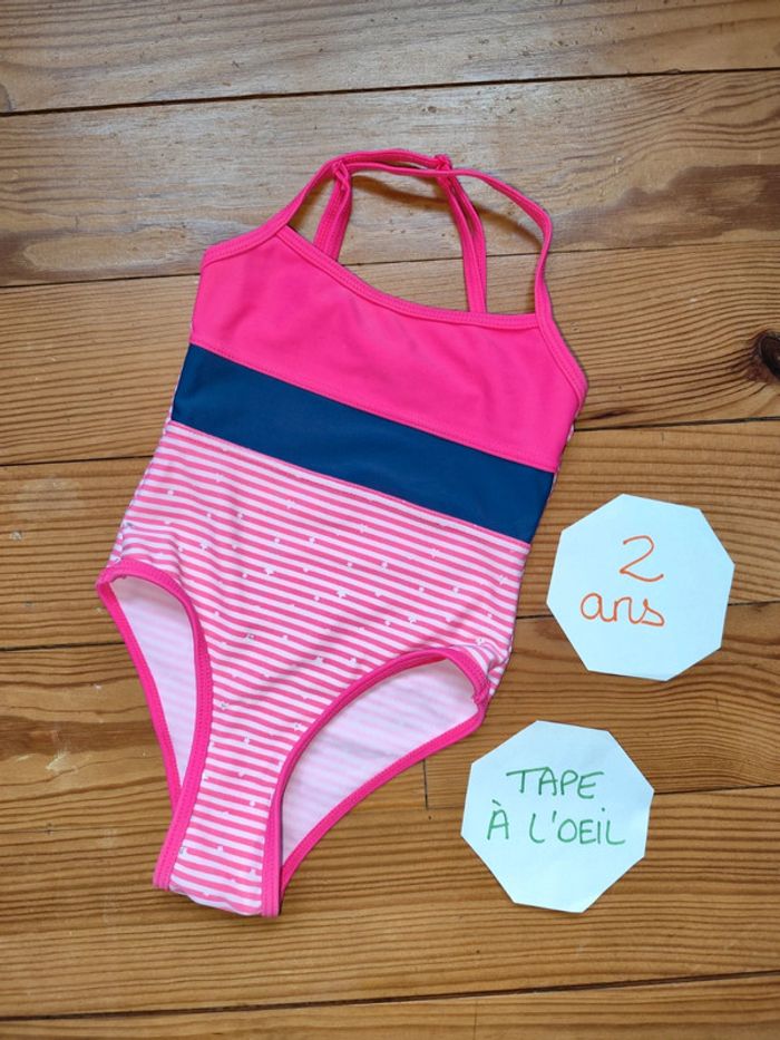 Maillot de bain une pièce, rose fushia et bleu. Très bon état. Marque : Tape à l'oeil Taille : 2 ans #celine76590fille2ans