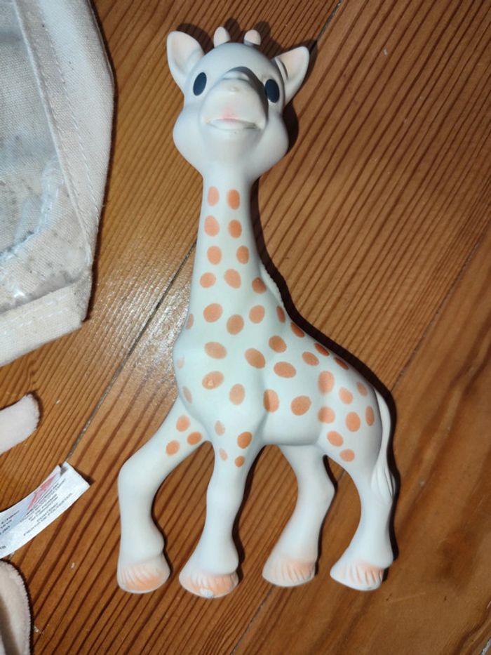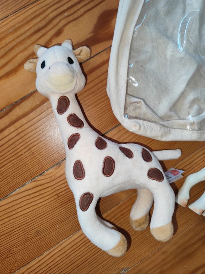 Duo Sophie la girafe : une peluche hochet et une caoutchouc pouic-pouic. Très bon état pour la peluche et bon état général pour l'autre. Marque Sophie la girafe #celine76590enfantjouet