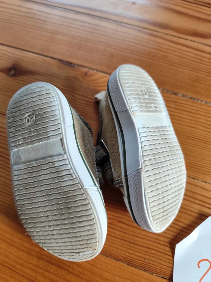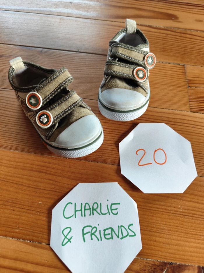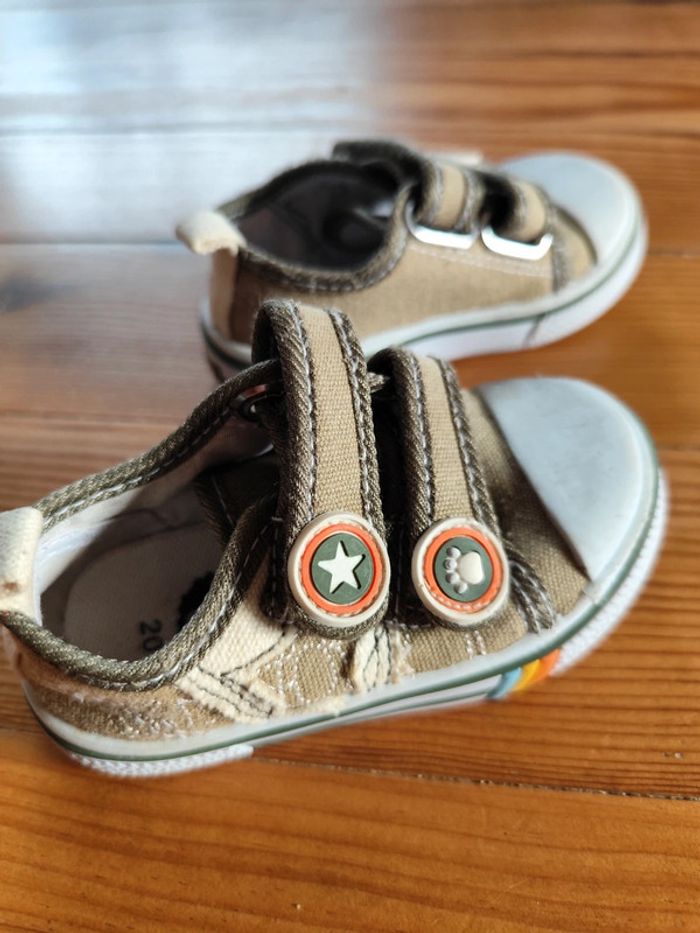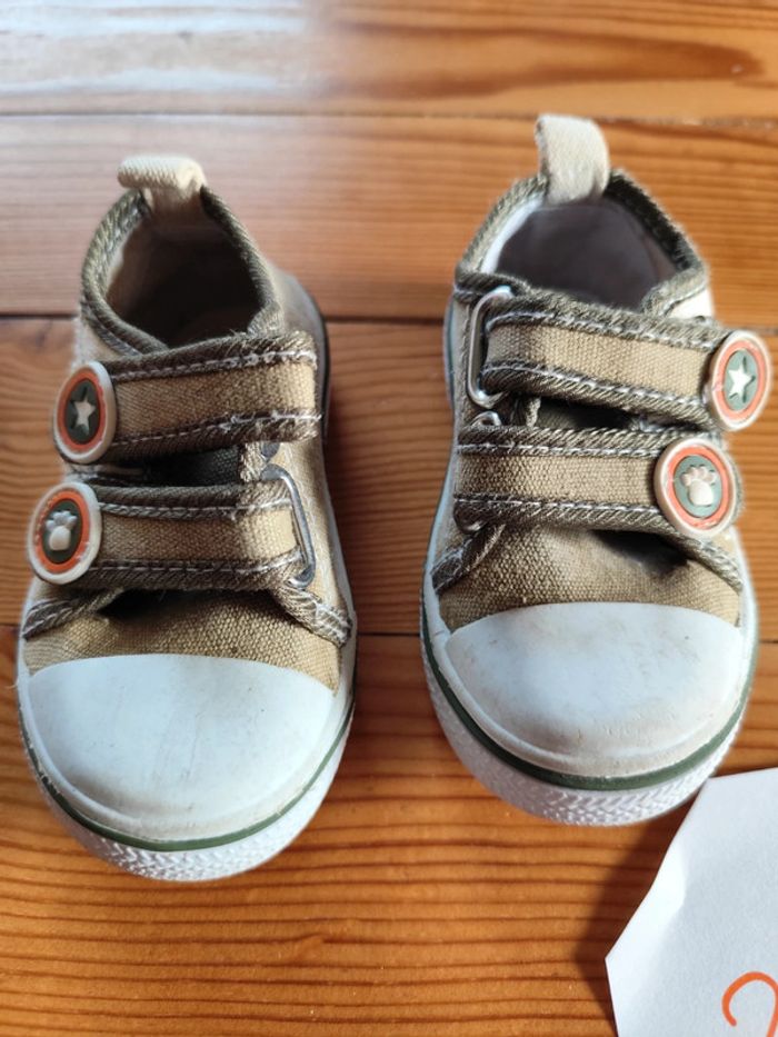 Baskets basses à scratch, kaki et blanc avec motifs. Bon état général (quelques traces d'usure). Taille 20 Marque Charlie & friends #celine76590garconchaussures