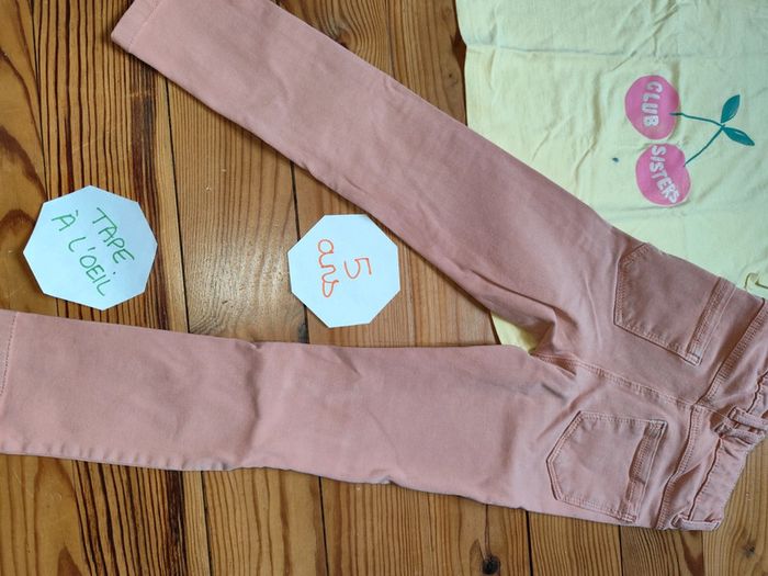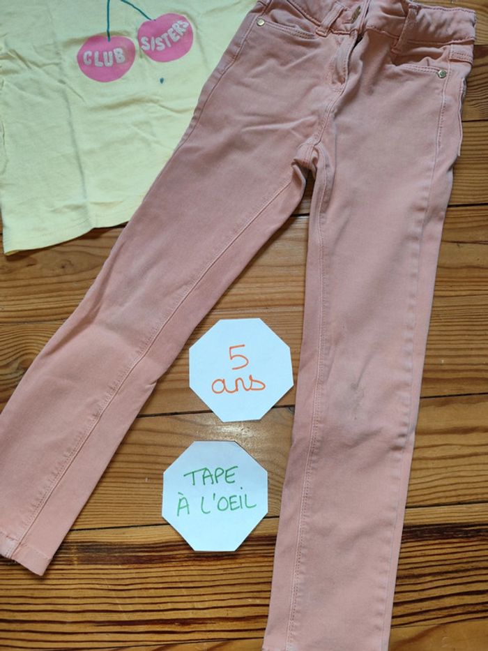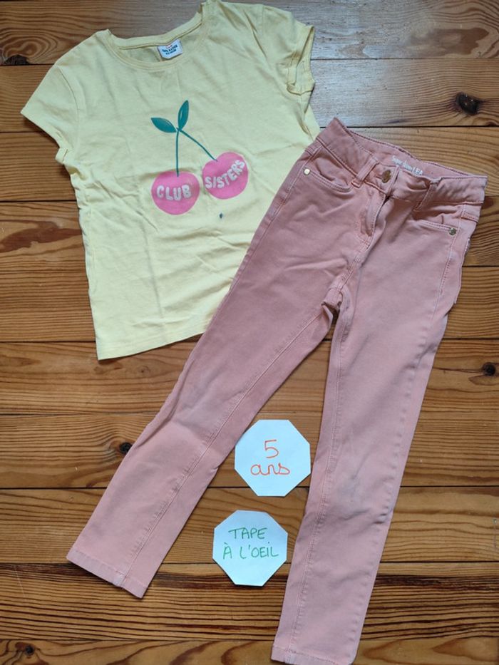 Ensemble deux pièces : jean super skinny , fermeture éclair et bouton, rose + tee shirt manches courtes, jaune avec motifs. Bon état (petite tâche sur le tee shirt et une sur le jean, voir photo). Marque : Tape à l'oeil Taille : 5 ans #celine76590fille5ans
