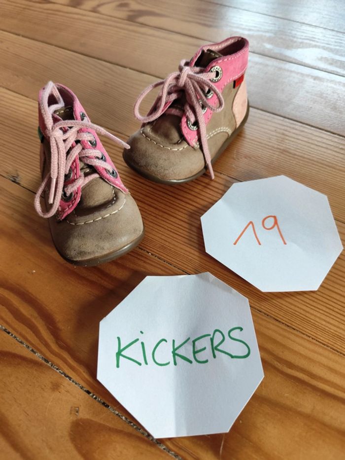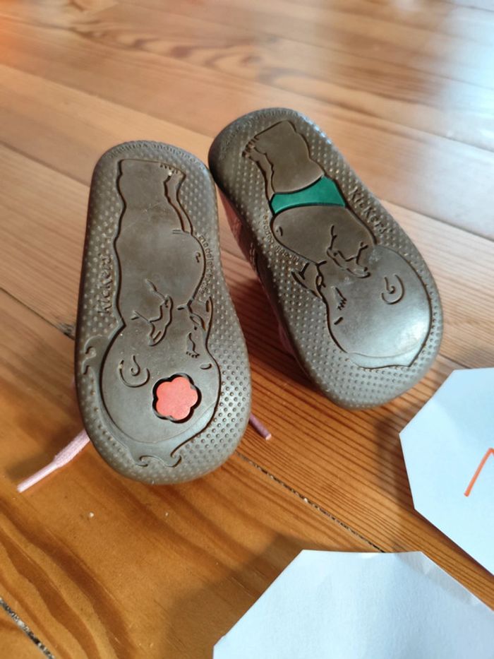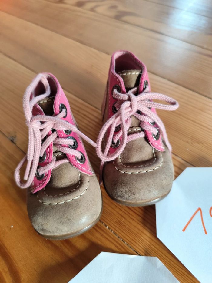 Chaussures en cuir premiers pas à lacets, marron et rose. Bon état général (servie mais encore portable). Taille 19 Marque Kickers #celine76590fillechaussures
