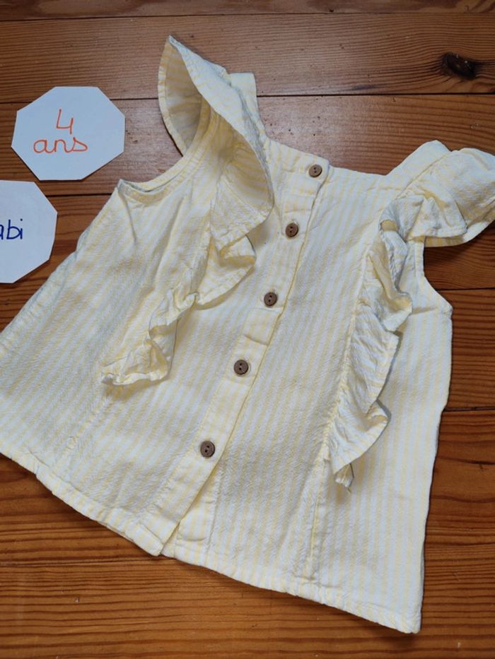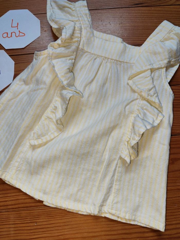 Blouse à bretelles et volants, fermeture boutonnée dans le dos, jaune à rayures blanches. Très bon état. Marque : Kiabi Taille : 4 ans #celine76590fille4ans