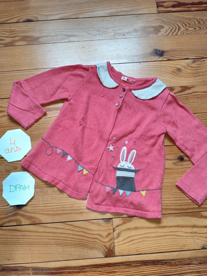 Gilet manches longues en laine, fermeture boutonnée, rose avec motifs. Très bon état. Marque : DPAM Taille : 4 ans #celine76590fille4ans