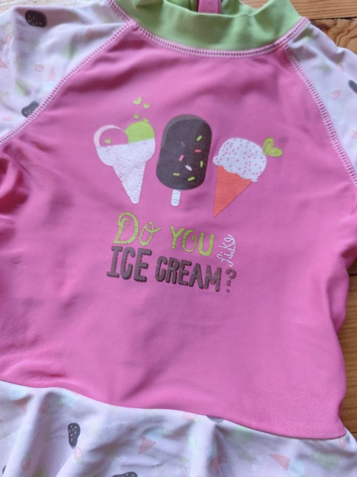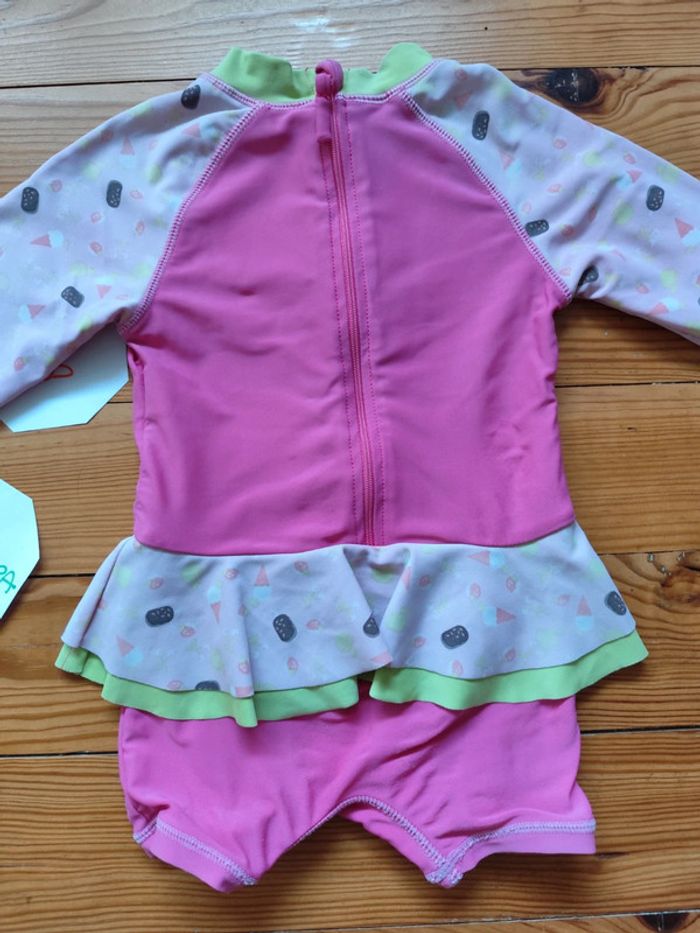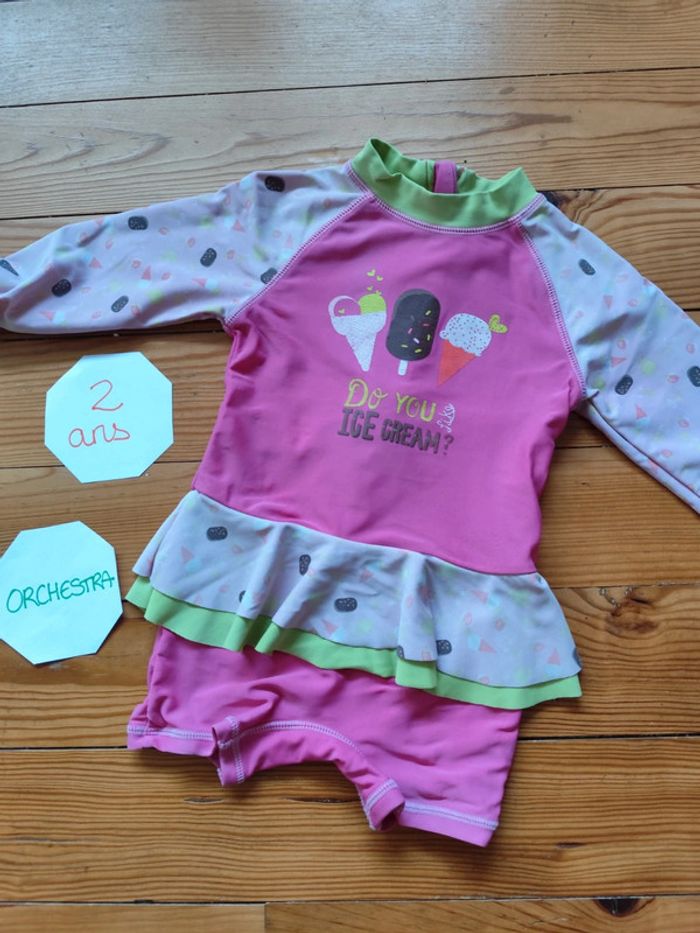 Maillot de bain une pièce manches longues, zippée dans le dos et pression entre les jambes, rose avec motifs. Bon état (porté) Marque : Orchestra Taille : 2 ans #celine76590fille2ans