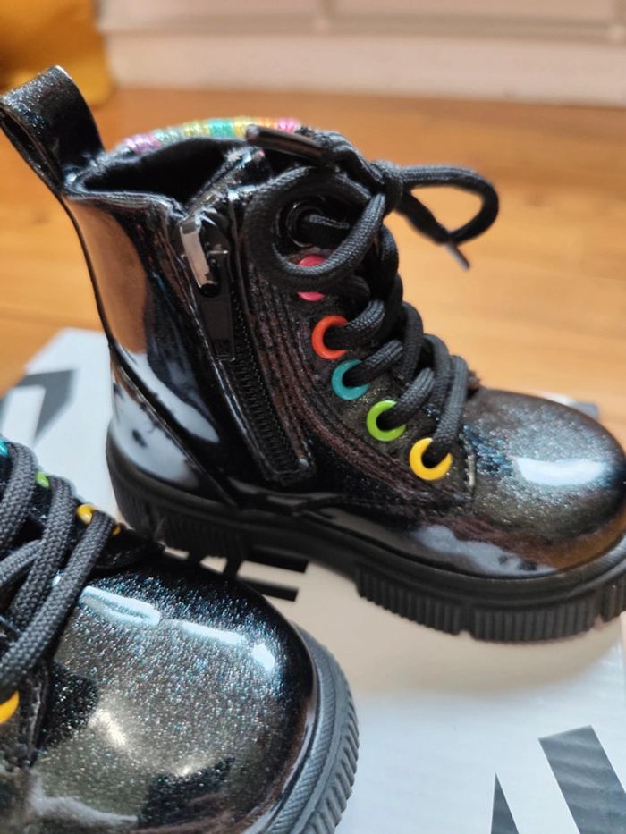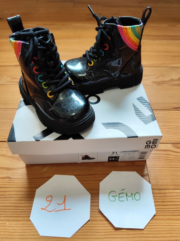 Bottines en cuir avec lacets et fermeture, noire pailleté avec motifs colorés. Très bon état comme neuve car très peu mise. Marque : Gemo Taille : 21 Encore en vente en magasin #celine76590fillechaussures