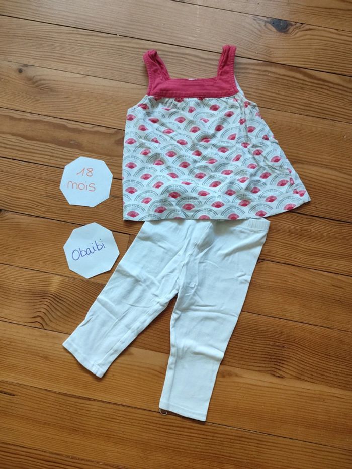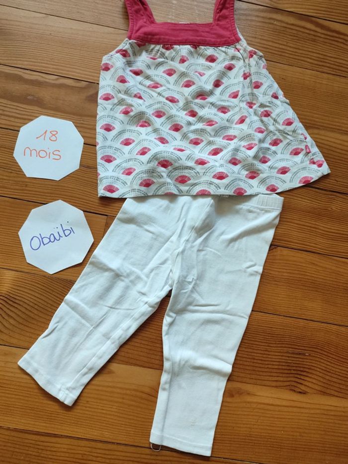 Ensemble été, débardeur blanc avec motifs fushia et gris, boutons dans le dos + legging blanc. Très bon état. Marque Obaïbi Taille 18 mois (80 cm) #celine76590fille18mois