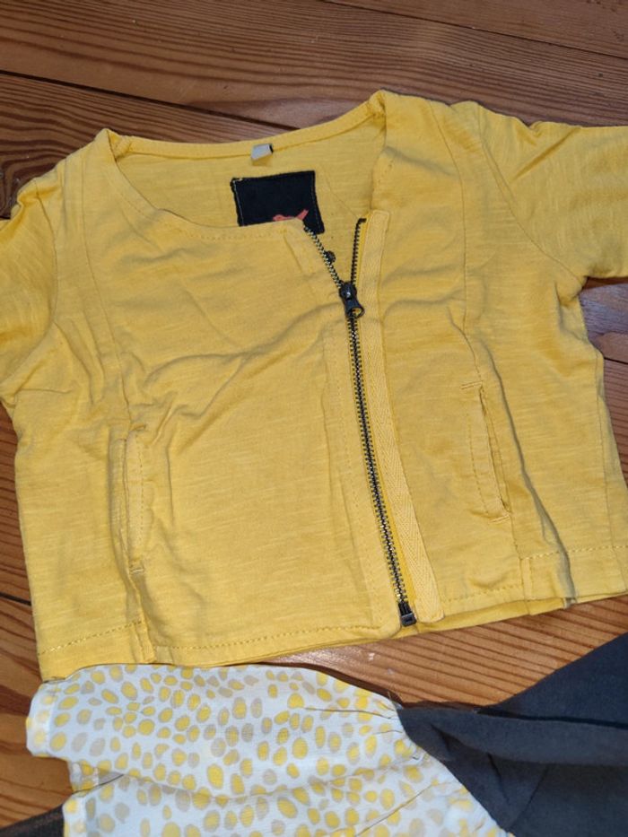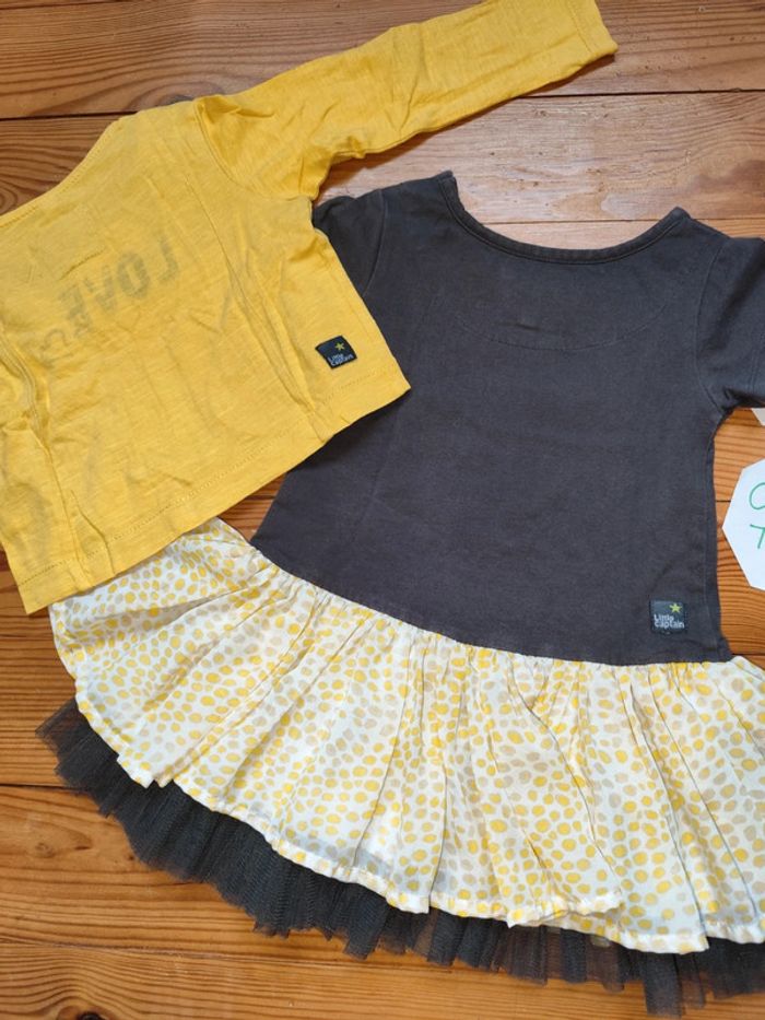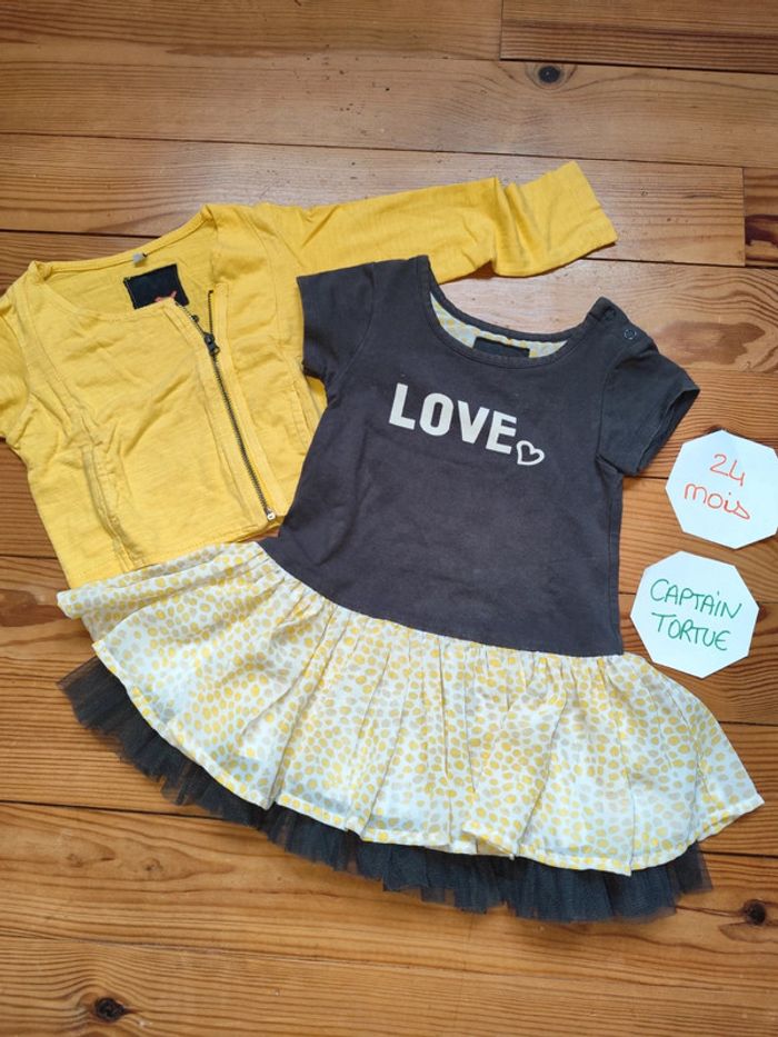 Ensemble robe à volants manches courtes grise et jaune (pression épaule)+ gilet jaune, fermeture éclair. Très bon état. Marque : Captain Tortue Taille : 24 mois - 92cm #celine76590fille24mois