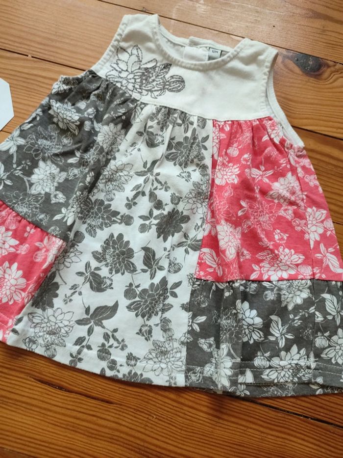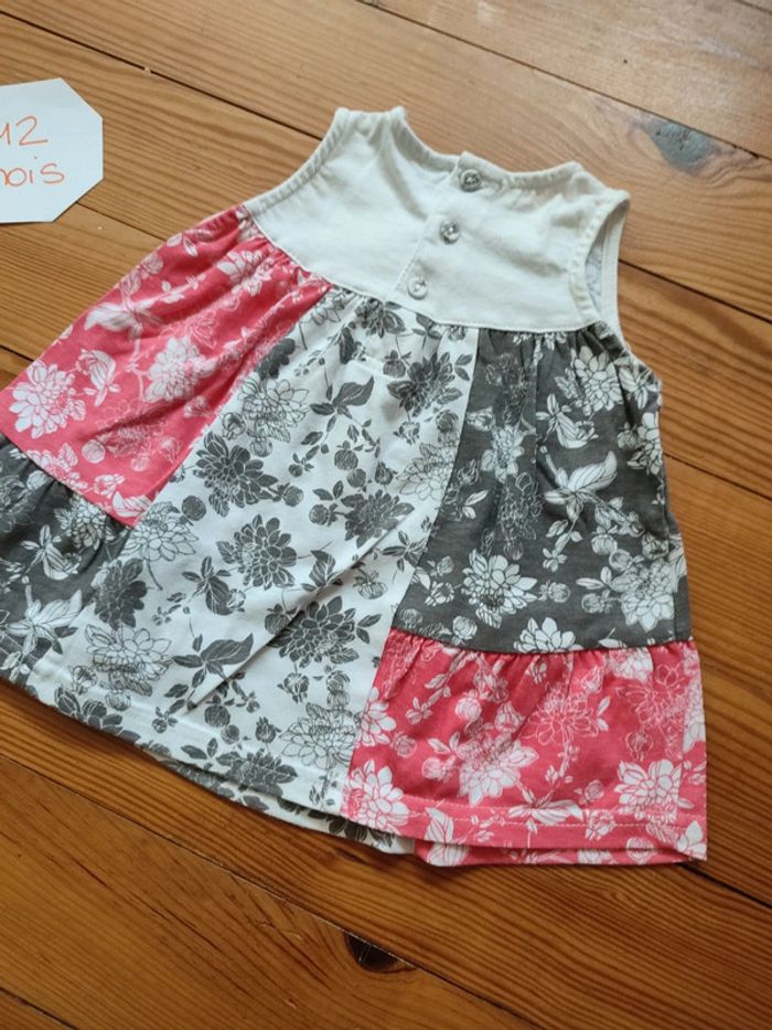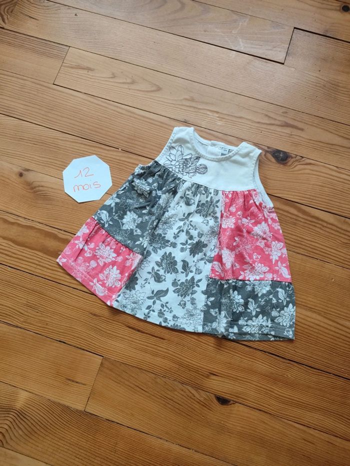 Tunique sans manche, fermeture boutonnée dans le dos, blanche/rouge/grise avec motifs fleurs. Très bon état. Marque Inconnue Taille 12 mois #celine76590fille12mois