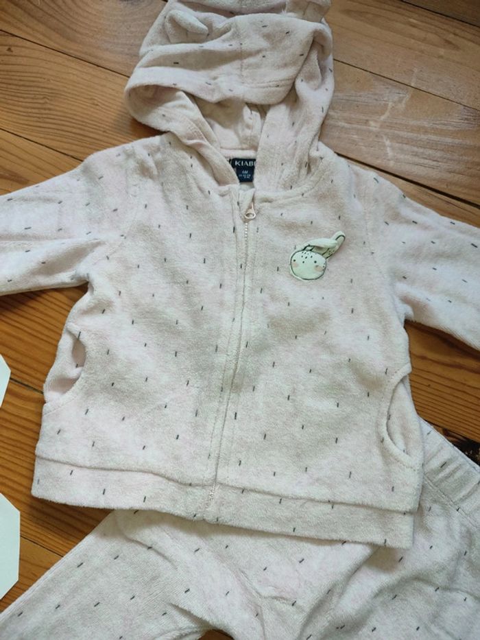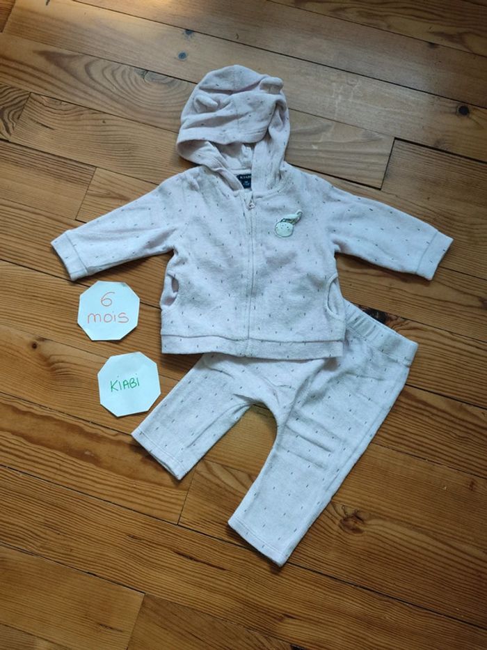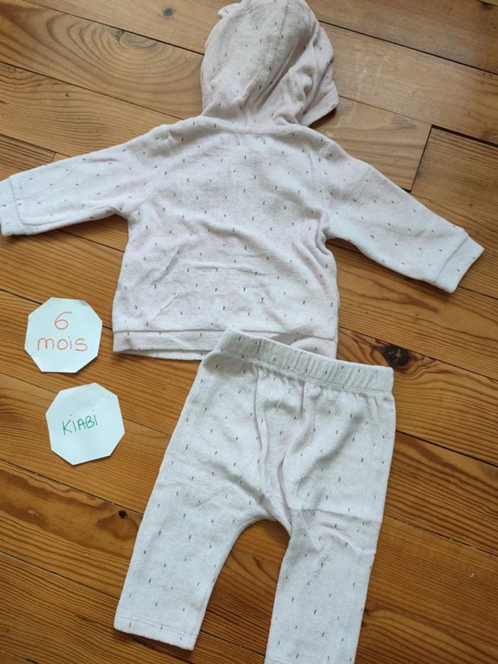 Ensemble survêtement polaire, veste zippée à capuche et pantalon élastique, rose pâle avec motifs noir. Très bon état. Marque : Kiabi Taille 6 mois #celine76590fille6mois