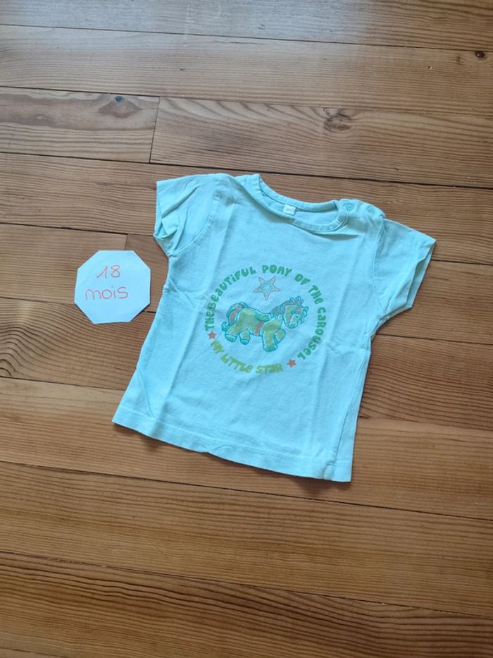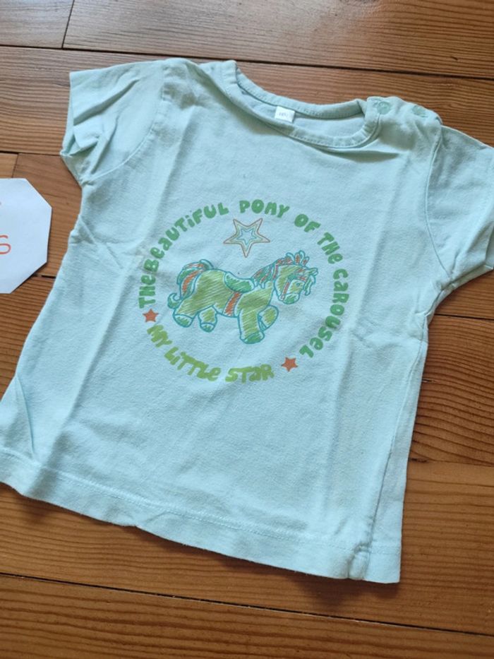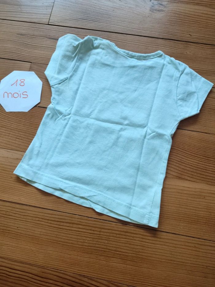 Tee shirt manches courtes, fermeture boutonnée sur l'épaule, vert clair avec motifs. Très bon état. Marque inconnu Taille 18 mois (80 cm) #celine76590fille18mois