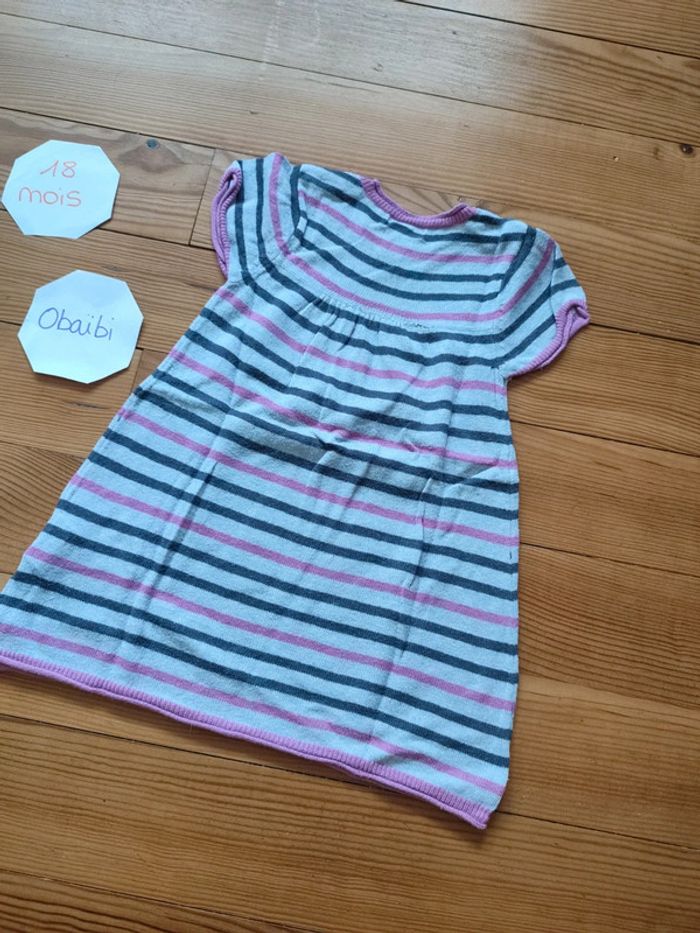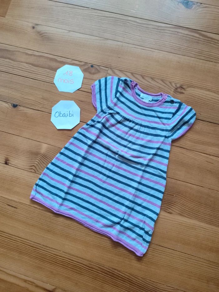Robe en laine légère, manches courtes, couleur grise à rayures noires et rose. Fermeture boutonnée sur l'épaule. Très Bon état. Marque Obaïbi Taille 18 mois (80 cm) #celine76590fille18mois