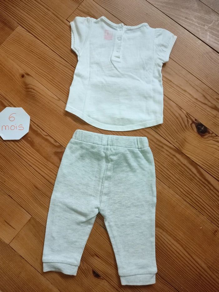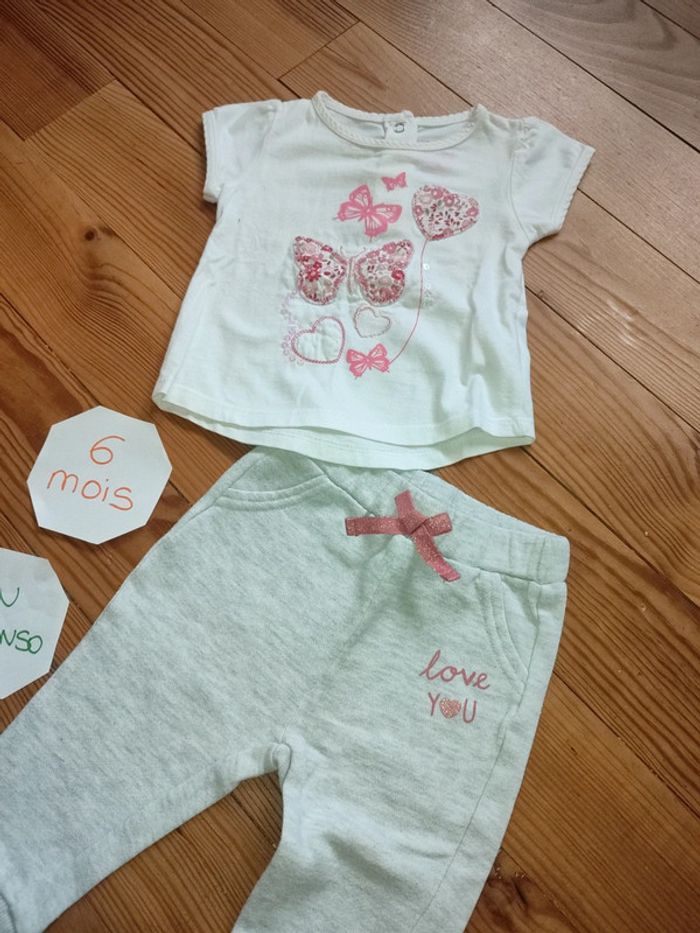 Ensemble tee shirt manches courtes, fermeture boutonnée dans le dos (blanc avec motifs rose) et jogging gris clair avec écritures rose. Très bon état. Marque : In Extenso Taille 6 mois #celine76590fille6mois